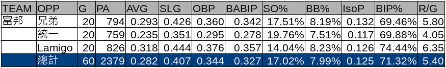 根據過去研究指出,BABIP並非選手完全可控的項目,雖然打擊上會受到BIP%,也就是把球擊入場內比例的影響,可是太過偏高或偏低的BABIP通常跟臉黑臉白比較有關,從上列數字來看,似乎只能說富邦打者整隊曬了太多太陽,臉黑的一塌糊塗。