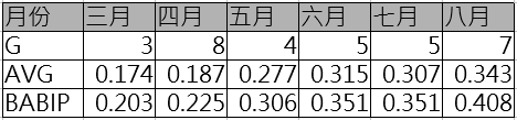 或許你會覺得「怎麼可能倒楣這麼久」,可是如果把富邦每個月的BABIP列出來,你就會發現其實富邦在五月已經有小幅度復甦,六月就開始大爆發,完全符合「BABIP受到運氣掌控,長期下來會回歸正常」的趨勢。