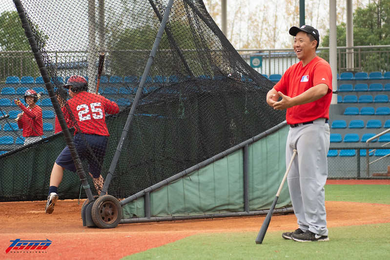 吃完午飯後,球員開始進行打擊練習,這時常州發展中心來的球員也已經在場上熱身。投手丘上正在餵球的是張寶樹。