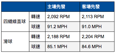事實上,單就陳偉殷掌握度最高的「球威」來看,主客場沒有差別。客場無論在直球和滑球的轉速、速差,都還比主場略佳,表示陳偉殷在投球上並沒有因為場地不同而有明顯影響。Suarez的觀察只是2場比賽之間的差別,和整季的客場球威表現並不相符。