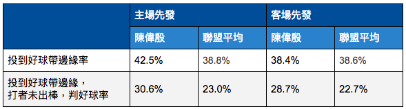 數據顯示陳偉殷在控球上的確有差別。客場出賽的陳偉殷能夠把球控制在邊邊角角的比例較低,只有 38.4%,主場是42.5%,符合投手教練「4到5個可能造成傷害的失控球」觀察,也和三振與四壞保送情況相符。