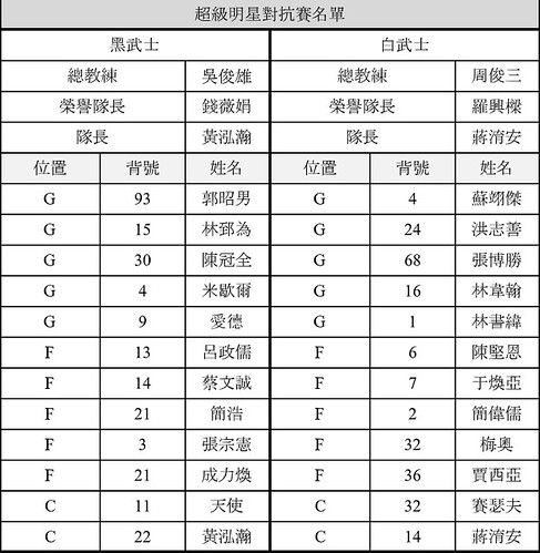 本次黑、白武士總教練將分別由上半季例行賽第1、2名的金酒執行教練吳俊雄、台啤總教練周俊三擔綱,2隊教練可以從母隊各選2名球員進入2月16日於桃園巨蛋開打明星賽,此外先發5人除隊長外,其餘4人將由教練決定。