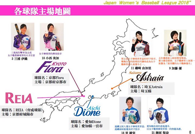 日本女子職棒聯盟,從最初僅兩支球隊的窘況,這十年經過了許多的改革終於在2015年以三支一軍球隊(京都Flora、愛知Dione及琦玉Astraia)和一支育成球隊REIA的形式走到了第十週年。三支球隊各有不同風格,每年也會為了平均實力的考量調整球員,所以不會有像中華職棒一樣連續好幾年都是同一支球隊稱霸的狀況。