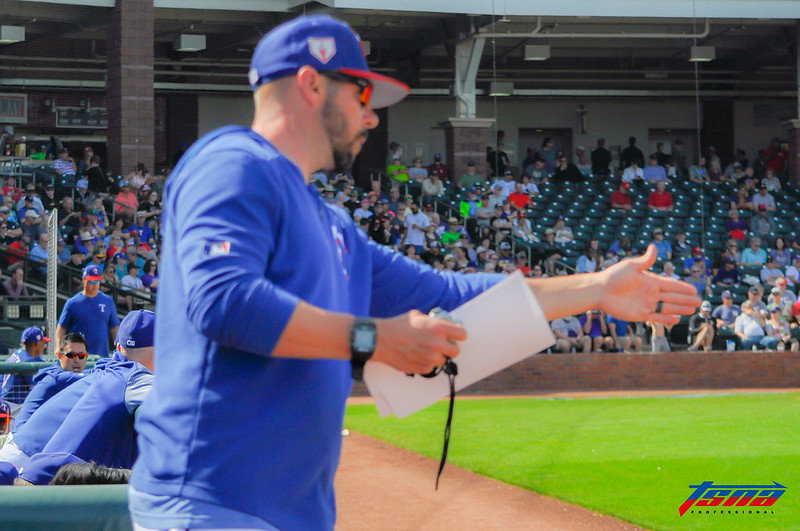 遊騎兵在春訓熱身賽指示外野佈陣站位的教練不是別人,正是在去年球季結束後取代Jeff Banister,成為遊騎兵新科總教練的Chris Woodward。