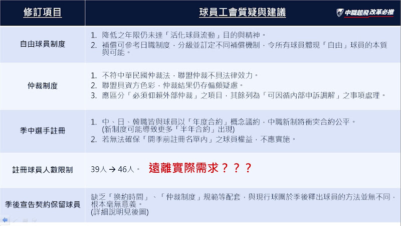 針對聯盟提出的修訂內容,球員工會提出質疑與建議如後頁附圖。
