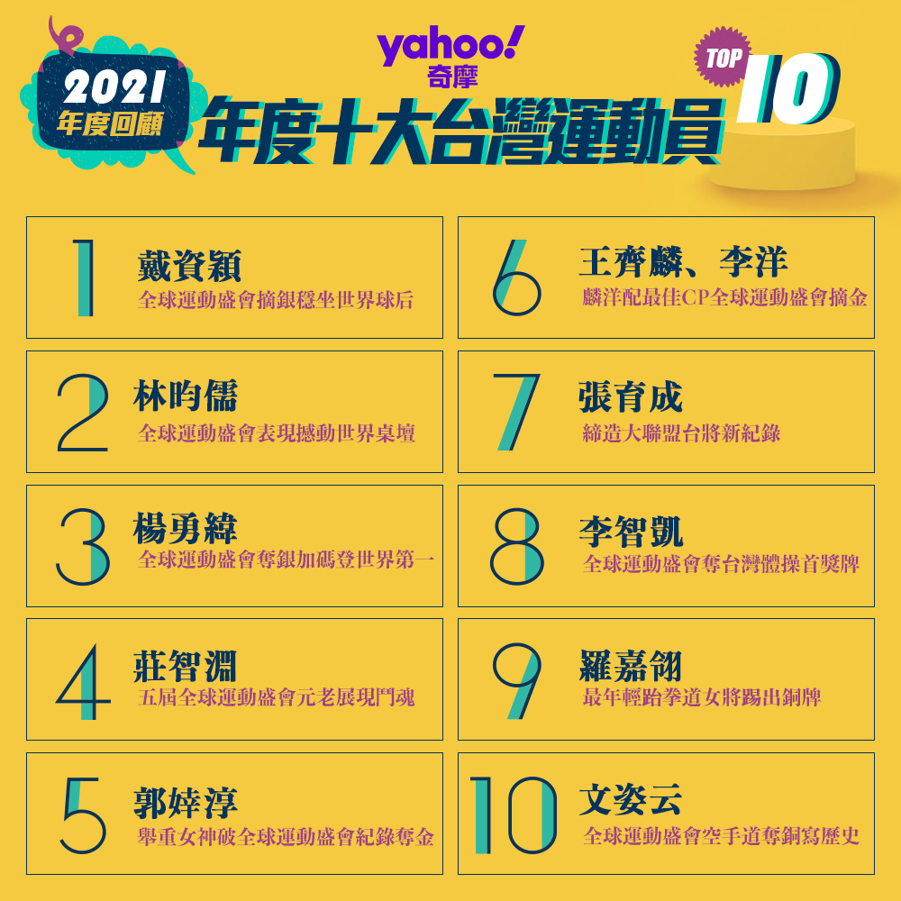Yahoo奇摩今天公佈2021年度運動榜單,包括「十大運動事件」、「十大台灣運動人物」、及「十大外國運動人物」。