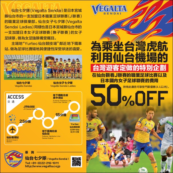 【VEGALTA SENDAI新聞稿】隨著台灣虎航於6月開始提供台北桃園直航仙台,只要三個多小時,前往日本東北一點都不難!吃完著名美食牛舌之後,還可再看一場精彩的足球賽。