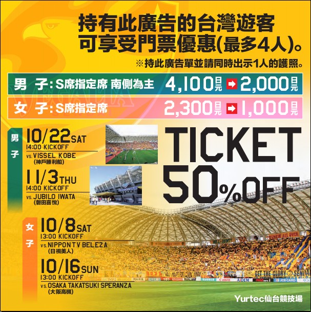 現在只要搭乘台灣虎航,取得機內放置之虎航與仙台七夕隊的特別企劃傳單前往觀賞球賽,於購票時出示此傳單及護照即可馬上以50%的優惠購買門票(四人以內),詳情請參考傳單。
