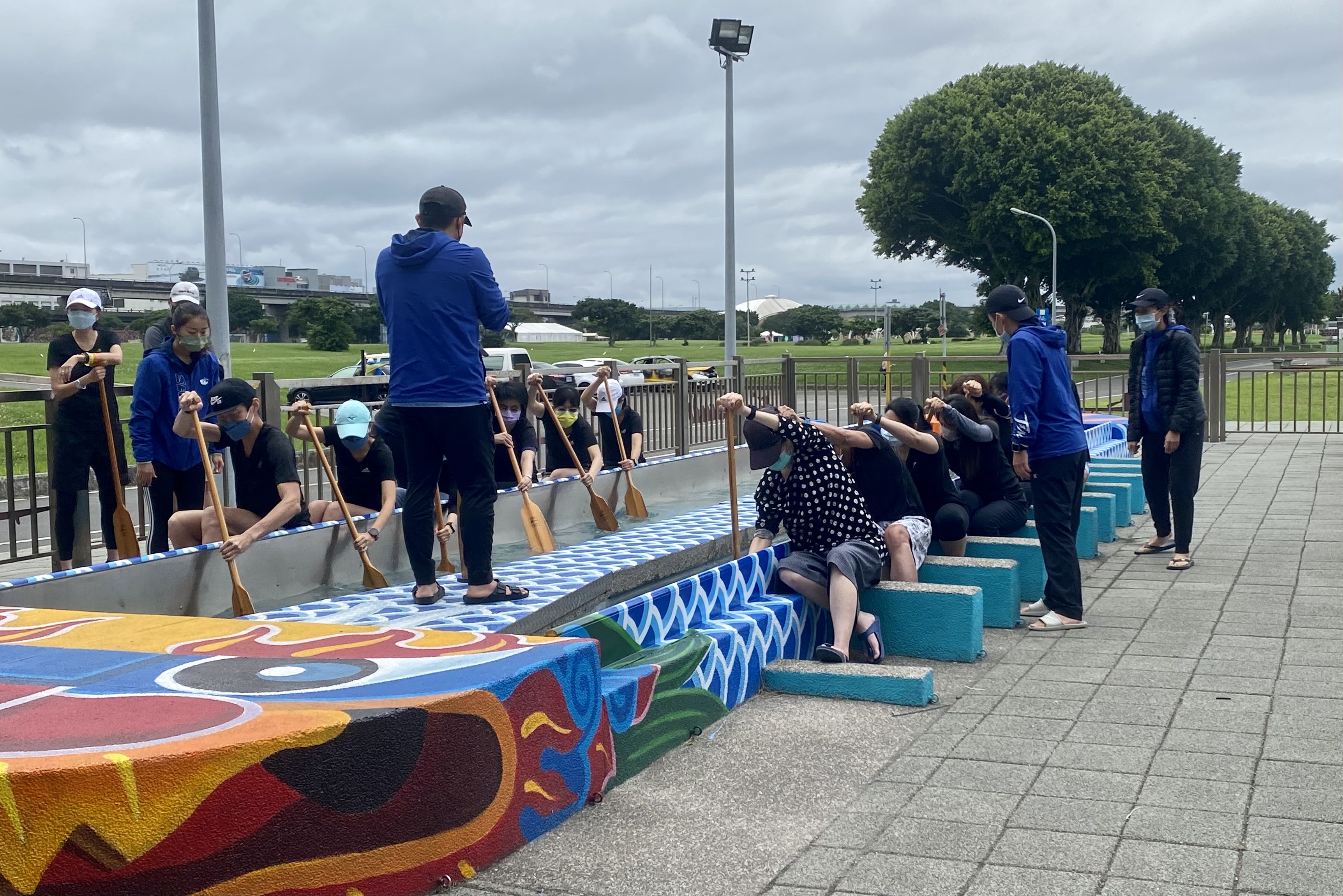 「睜一隻眼閉一隻眼」龍舟隊的團隊練習。(實習記者謝依潔/現場拍攝)