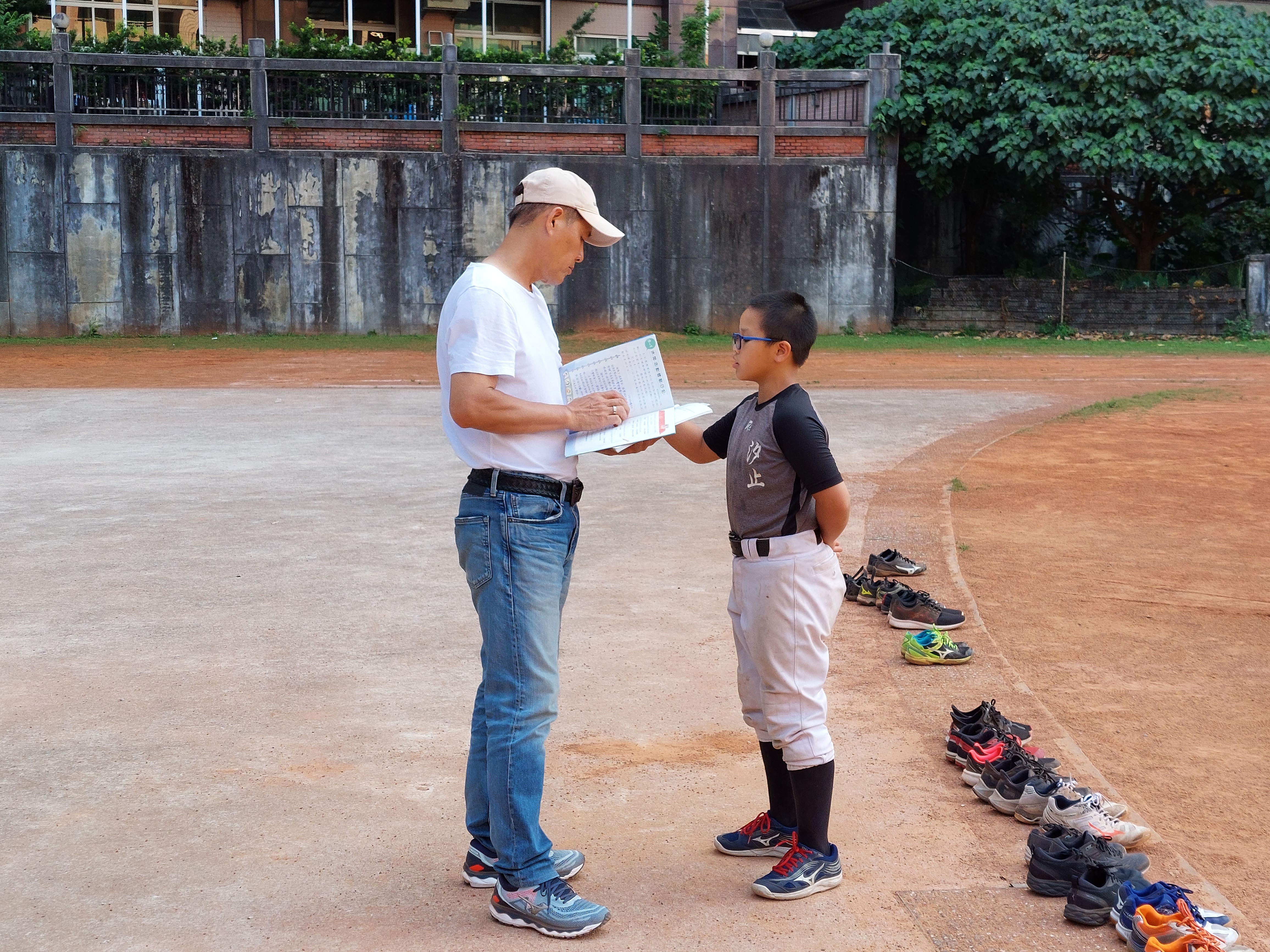 俊國熊「盜俠」張耀騰(左)目前擔任汐止國小少棒隊總教練,也關心球員們的功課。(廖德修攝)