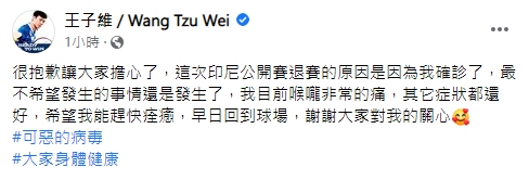 王子維在個人臉書上表示:「很抱歉讓大家擔心了,這次印尼公開賽退賽的原因是因為我確診了,最不希望發生的事情還是發生了,我目前喉嚨非常的痛,其他症狀都還好,希望我能趕快痊癒,早日回到球場,謝謝大家對我的關心。」他也在文章下方Hashtag了「可惡的病毒」和「大家身體健康」。