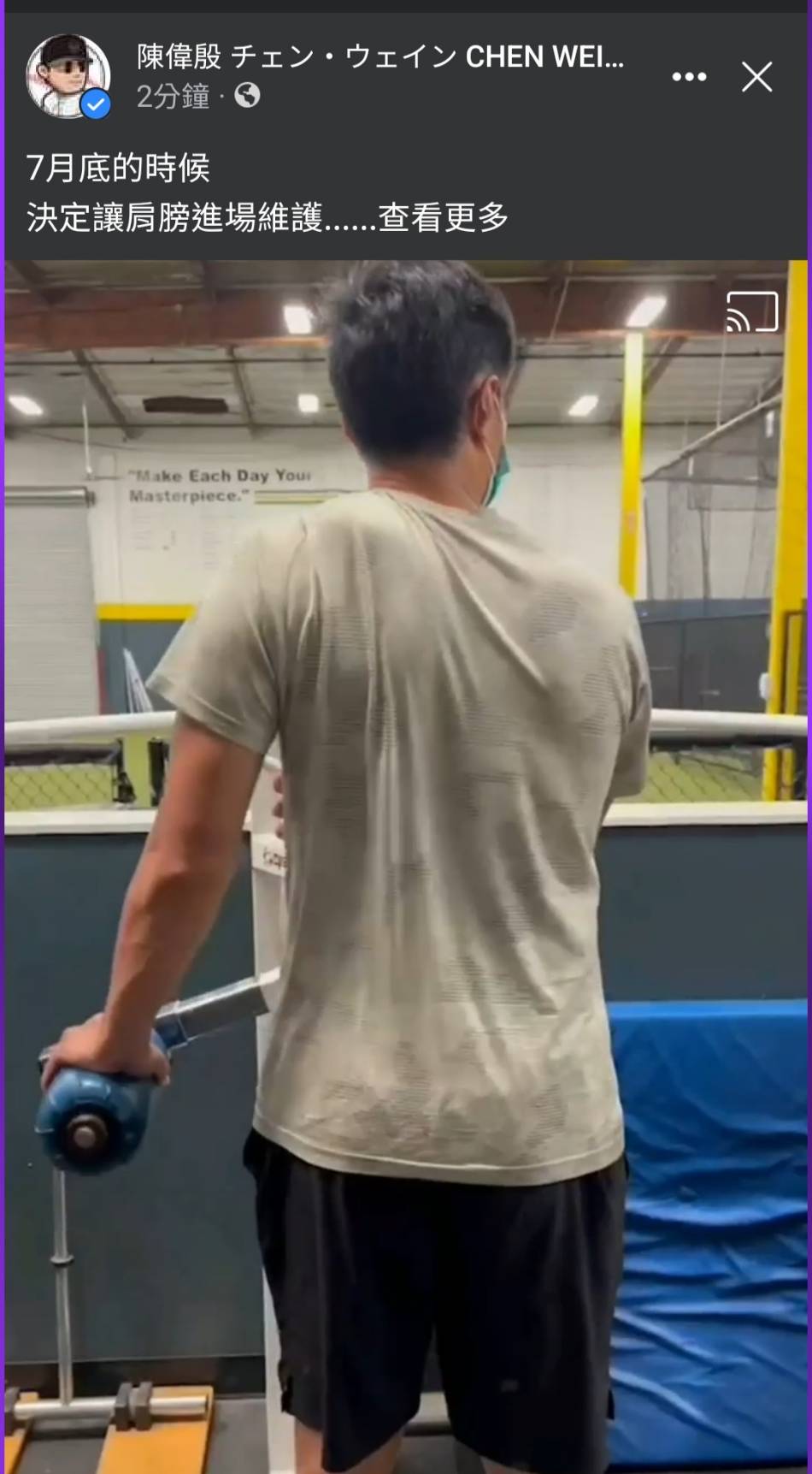 陳偉殷粉絲團發文:「7月底的時候,決定讓肩膀進場維護,以解決困擾了一段時間的肩膀問題,目前復健進度一切順利!」