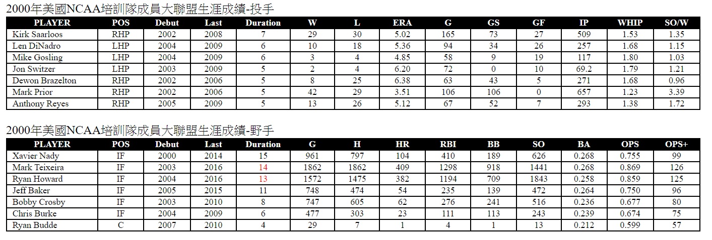當年的美國隊陣容當中也是大學球員的一時之選,22名選手中有14名最後都上到大聯盟。其中最耀眼的幾位明星選手莫過於是Mark Teixeira(四百轟的長青樹打者)、Ryan Howard(2005新人王、2006 MVP),Xavier Nady(史上第18位在選秀之後直接上大聯盟的選手)與Mark Prior(被操壞的有史以來最強大學投手,現在是道奇隊的投手教練);另外Bobby Crosby在2004年也贏得新人王的獎項。
