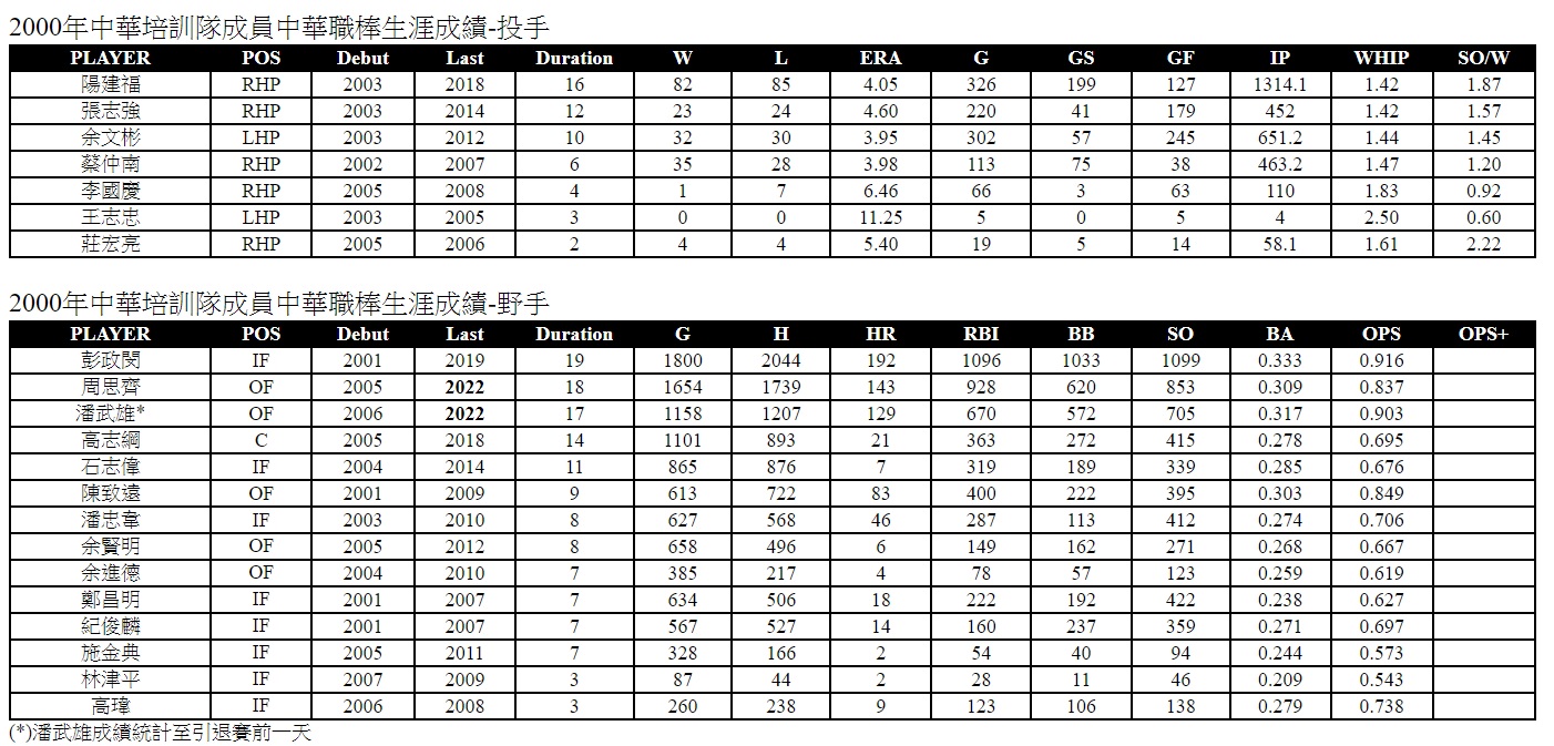 當然,在中華隊的部分,除了唐結傳之外,全隊最後都進了職業體系,其中又以彭政閔累計了高達19年的年資,比美國隊的任何一位都還要久(Nady 15年、Teixeira 14年、Howard 13年),累計1800場的場次也僅少於Teixeira的1862場。而在這兩支代表隊的陣容總共44名選手當中,除了美國隊的每一位選手都已經從職業生涯退役以外(Teixeira與Howard都在2016年高掛球鞋),中華隊的陣容裡高志綱、陽建福在2018退休、彭政閔也在2019年結束精彩的職業選手生涯,但最令人感到佩服的,莫過於是到現在還在場上拚戰的潘武雄(17年年資)以及周思齊(18年年資)。