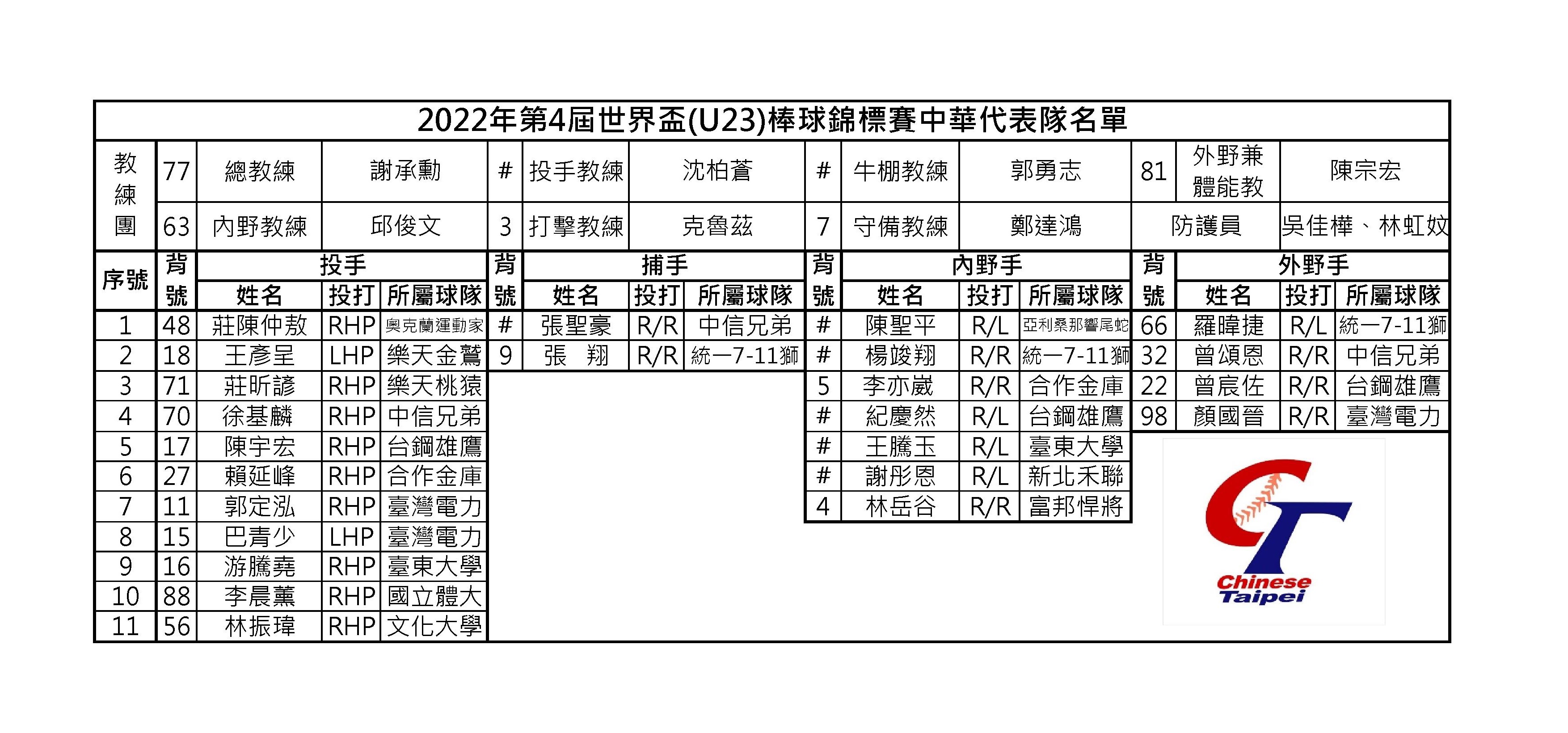 中華棒協今天公布U23世界棒球賽中華隊最後名單,中華職棒樂天桃猿莊昕諺,統一獅張翔、楊竣翔、羅暐捷,中信兄弟曾頌恩、張聖豪,以及旅外球員王彥程、莊陳仲敖、陳聖平都入選。