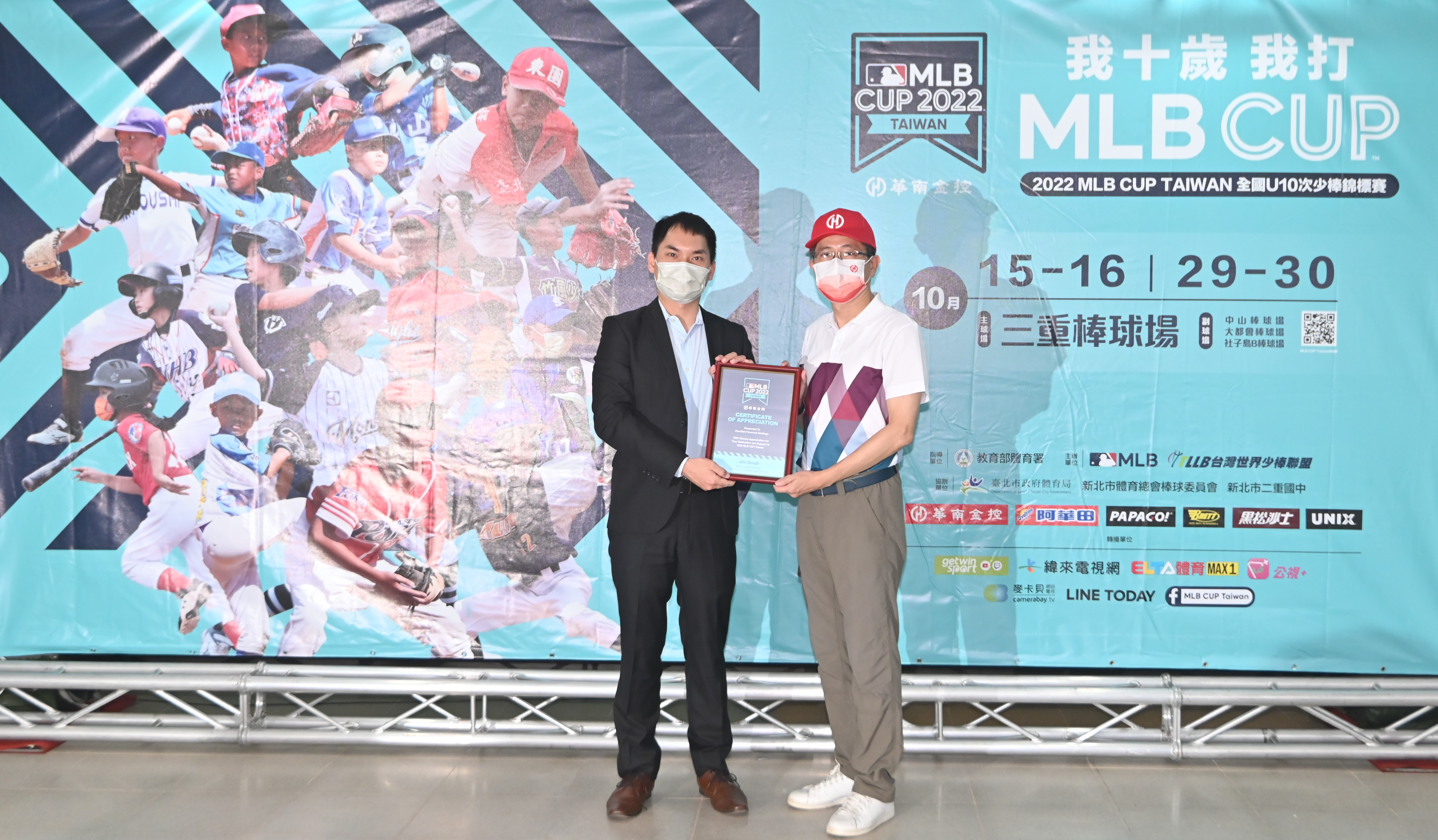 MLB臺灣區業務代表林偉傑(左)代表頒發感謝狀予華南金融控股公司總經理李耀卿(右)。(台灣世界少棒聯盟提供)