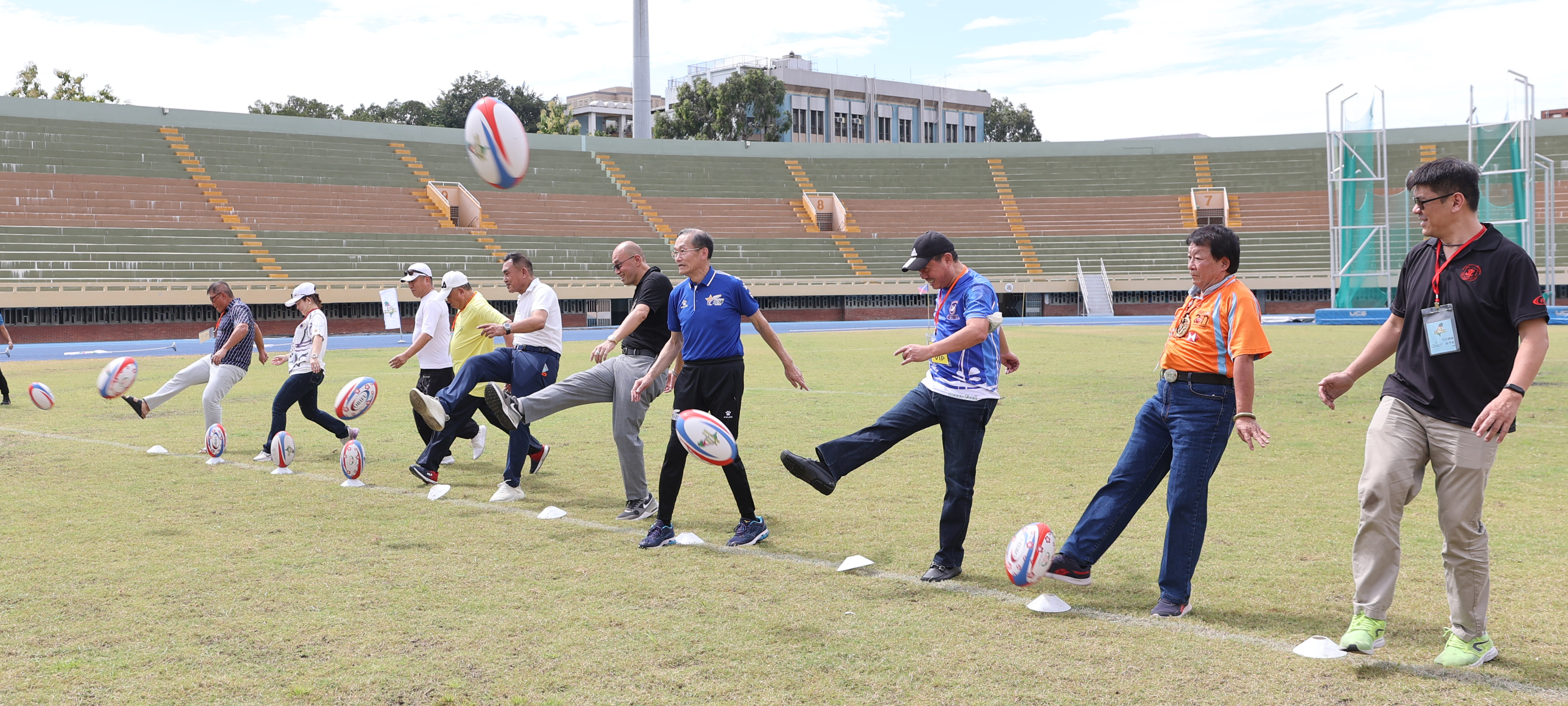 章富麟(右5)、杜元坤(右4)等為企業橄欖球聯賽開球。(中華民國橄欖球協會提供)