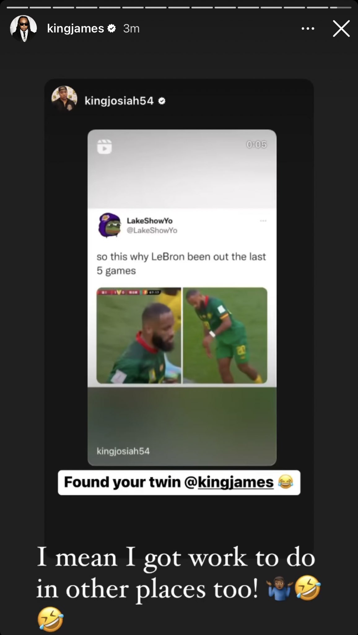 由於長得實在太像了,網友紛紛在底下留言,竟讓LeBron James本人出來回應,在IG限時動態發文:「I mean I got work to do in other places too!(我也有在其他地方工作)」。