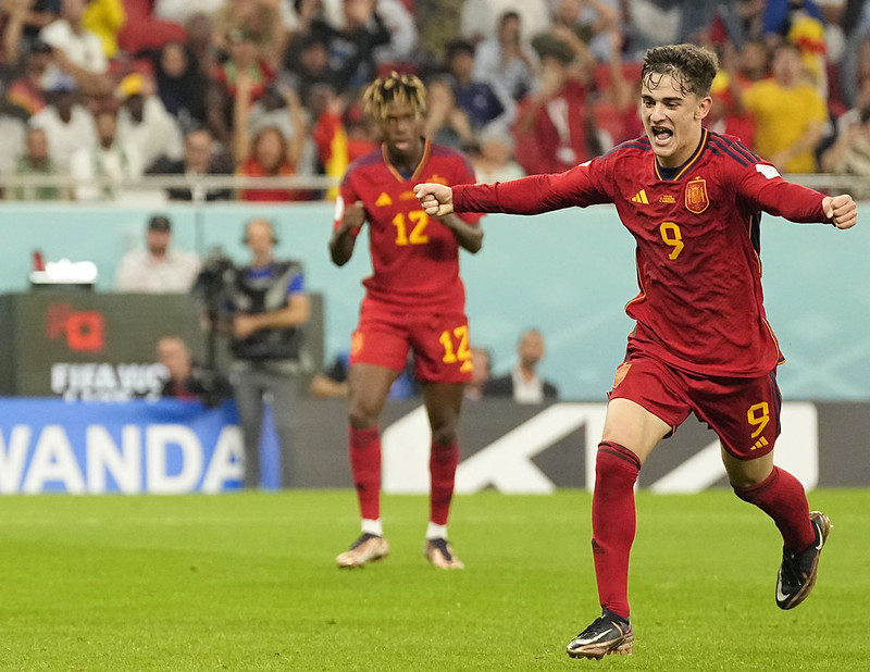 18歲西班牙中場Gavi是世界盃史上第2年輕進球者(右)。(達志影像)