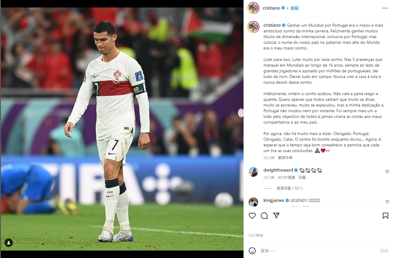 Ronaldo在發文寫下,「為葡萄牙贏得世界盃,是我職業生涯中最大,也最有野心的夢想。幸運的是,我贏得許多國際冠軍,包含為葡萄牙拿下冠軍。」他在2016年率領葡萄牙奪下歐錦賽冠軍,2019年也率隊奪下歐國聯冠軍。