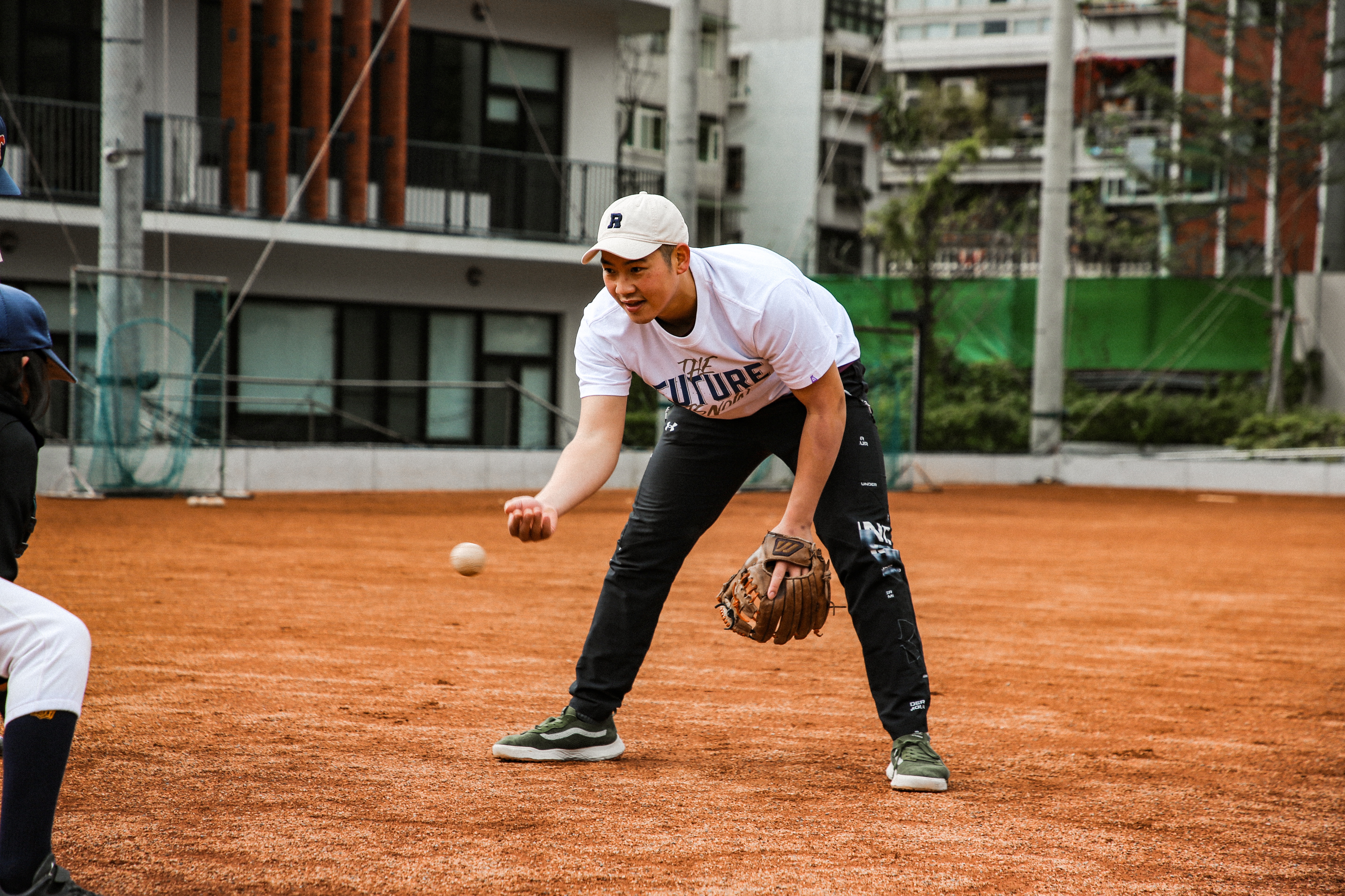 投手丘上,王彥程與曹竣崵緊盯著小投手,仔細的修正動作。日文溝通無礙的梁家榮負責傳授內野的守備技巧。而蔣少宏則是與樂樂棒球部進行分組對抗,和小朋友互動打成一片。