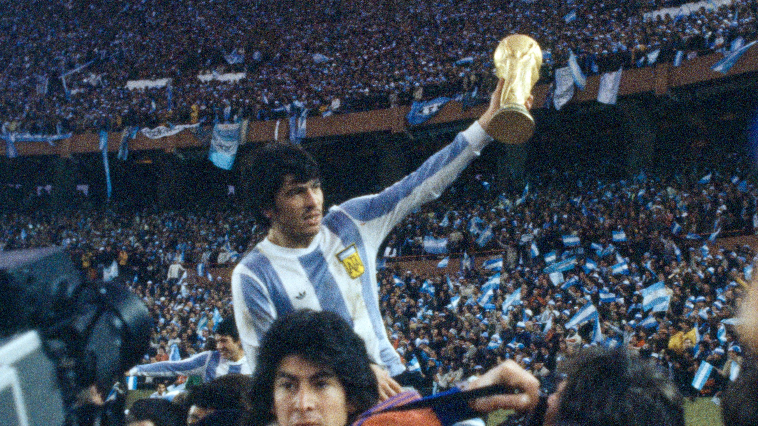 1978年阿根廷主場奪世界盃首冠,隊長Daniel Passarella高舉獎盃。(取自世界盃足球賽西班語版官方Twitter)