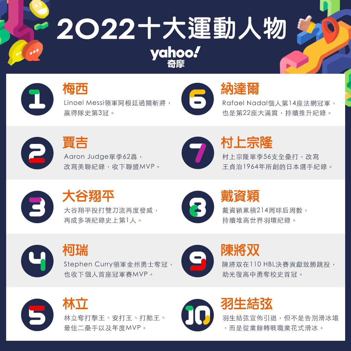 「十大運動人物」排行榜除了由率領阿根廷力抗法國贏得足球賽冠軍的梅西,毫無懸念奪下冠軍外,打破歷史紀錄的運動選手搶下過半席次,無論是洋基重砲「賈吉」、天使隊二刀流「大谷翔平」、網球名將「納達爾」皆雄踞榜單;台灣選手則由擁有在位最久球后週數紀錄的「戴資穎」入榜奪下第8!
