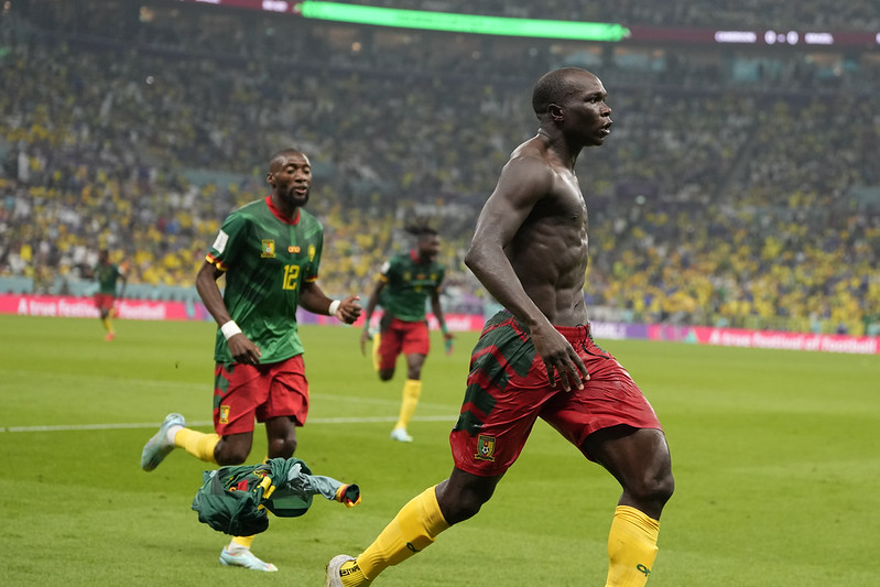 喀麥隆隊長Vincent Aboubakar(右一)對巴西攻進致勝球,興奮脫衣慶賀,領到黃牌。(達志影像資料照)