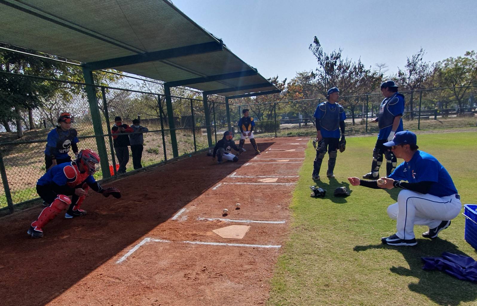 高志綱(右)訓練中華隊捕手群。羅惠齡/攝