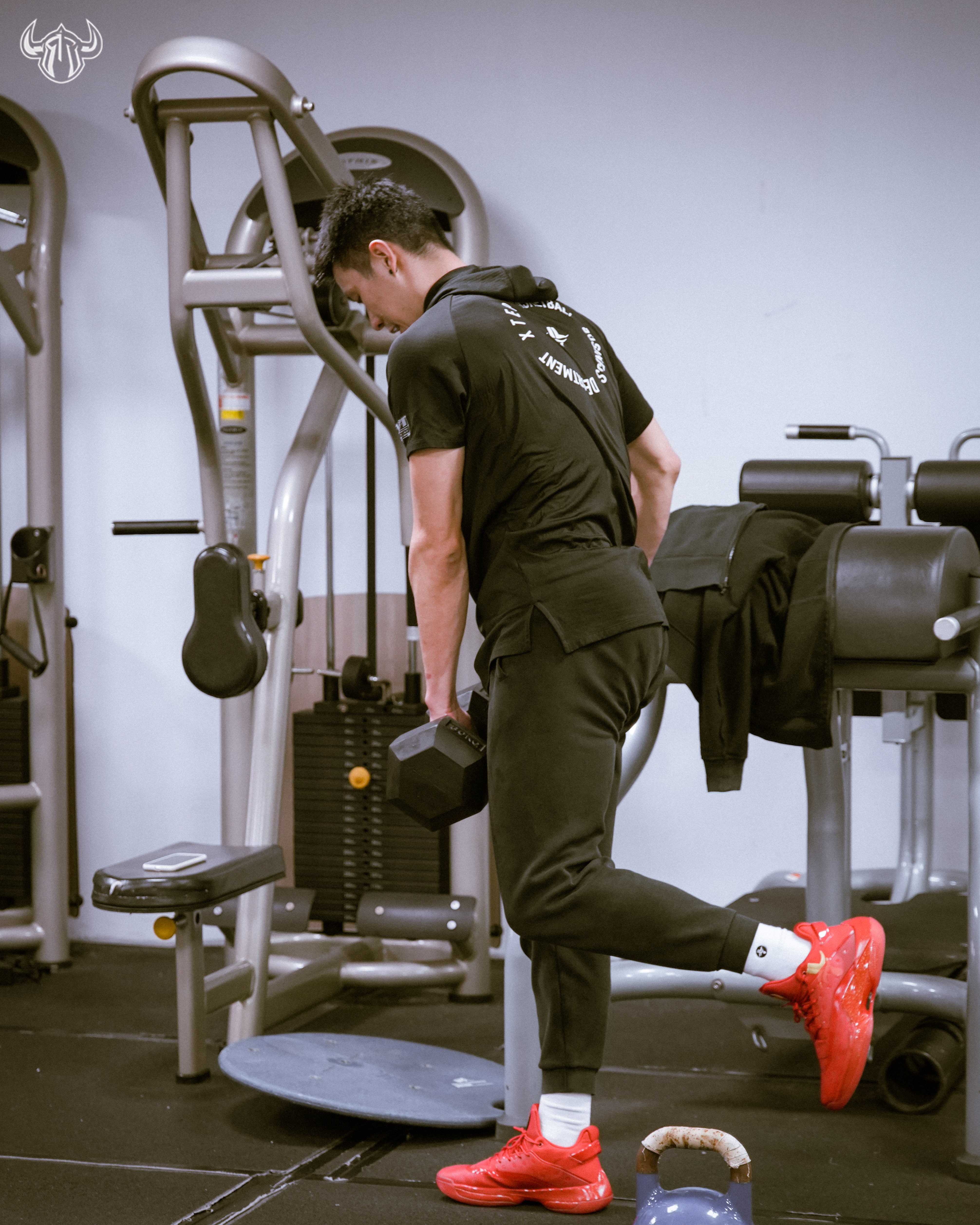 只見林書豪先穿黑色練習衣去做重量訓練,之後換穿無袖衣服,再去球場練球,有運球練還有跳投練習。