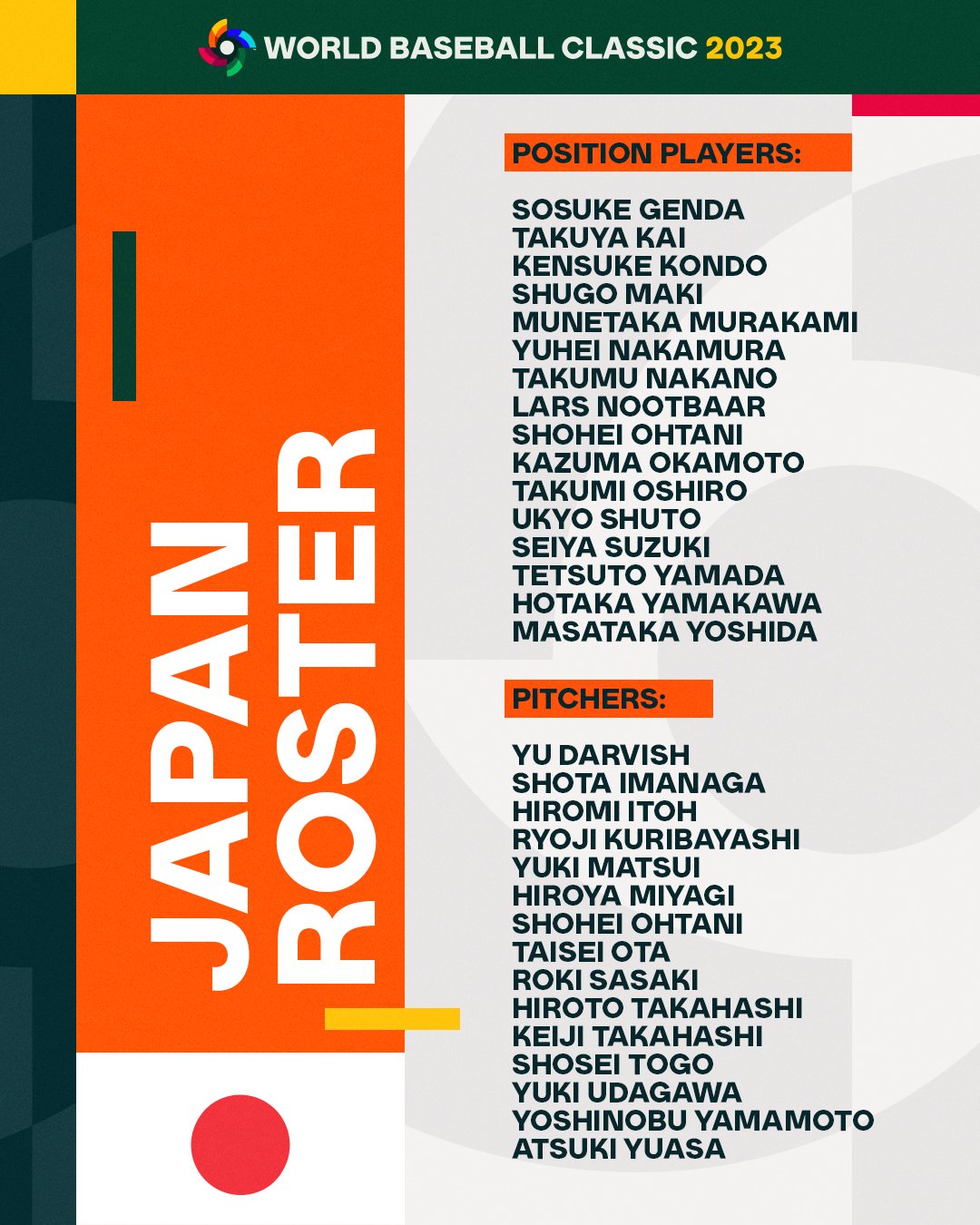 日本此次包含大谷翔平、鈴木誠也、達比修有,以及休賽季加入波士頓紅襪的吉田正尚全都在名單內。另外效力聖路易紅雀的Lars Nootbaar,因有日本血統且有意願參賽,此次也列入在內。另外像是山田哲人、山川穗高、村上宗隆,以及山本由伸等日職明星球員也都將參賽。