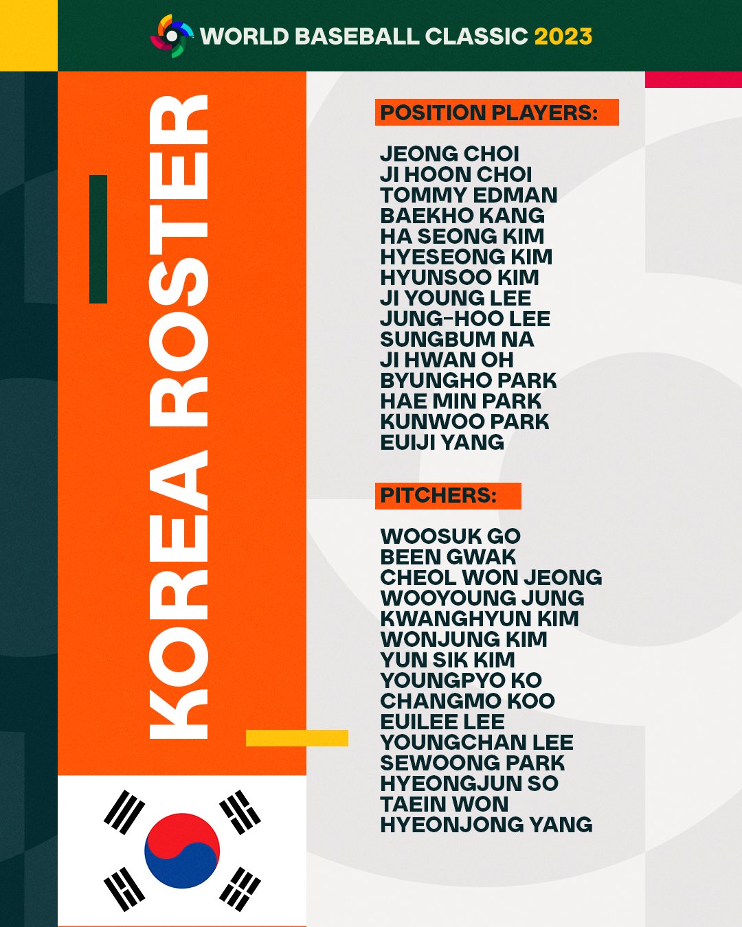 韓國部分因崔志萬退賽,因此目前在MLB效力的球員僅剩金河成及Tommy Edman,其餘由韓職球員組成。過去有MLB經驗的朴炳鎬和金賢洙,這次也都被列入名單之中。