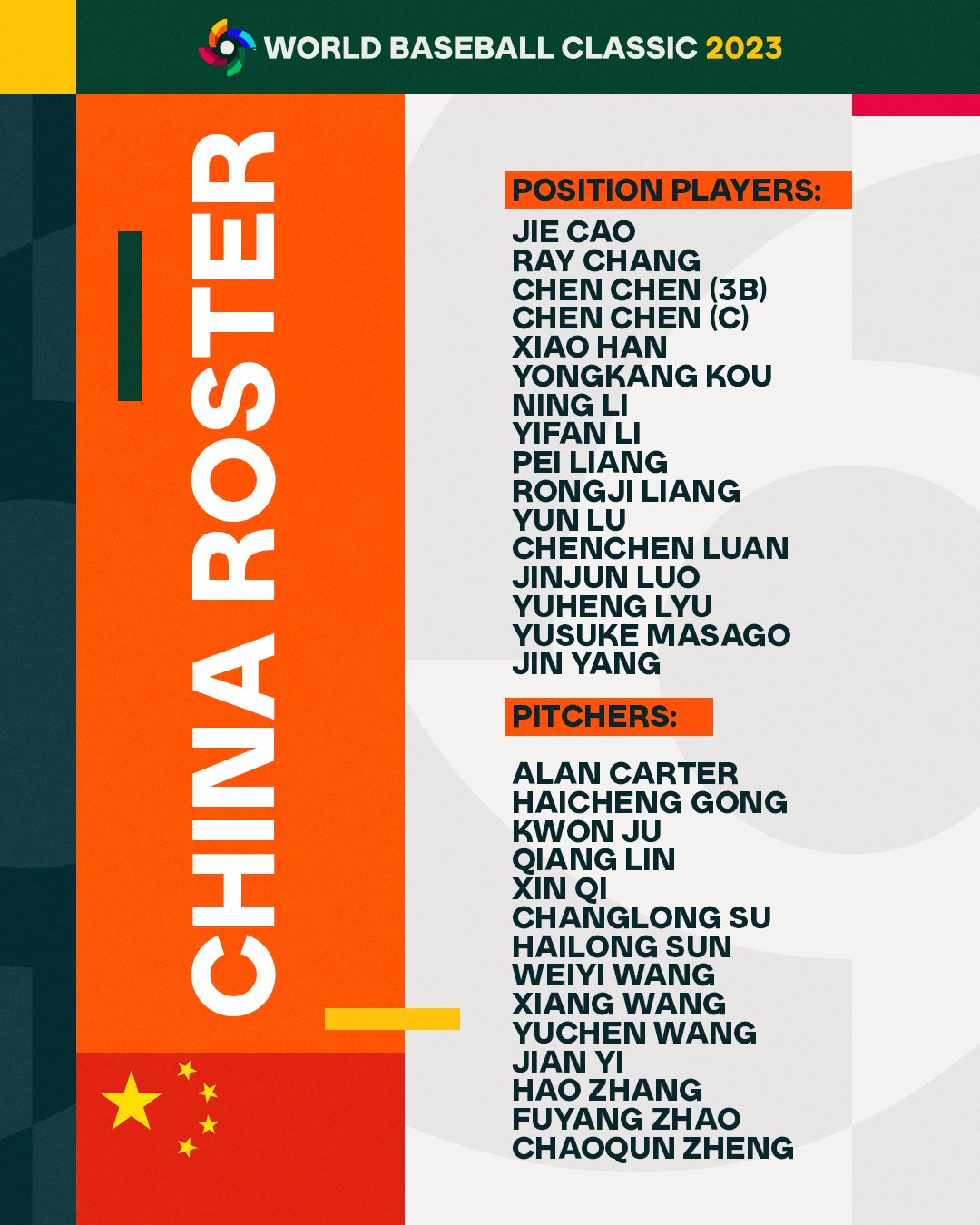 中國此次則是有韓職投手朱權助陣,目前效力KT巫師擔任中繼投手。老將張寶樹也在這次的陣容中,這將會是他連續第4屆參賽經典賽;天使小聯盟投手Alan Zhang Carter也確定將代表中國出賽。