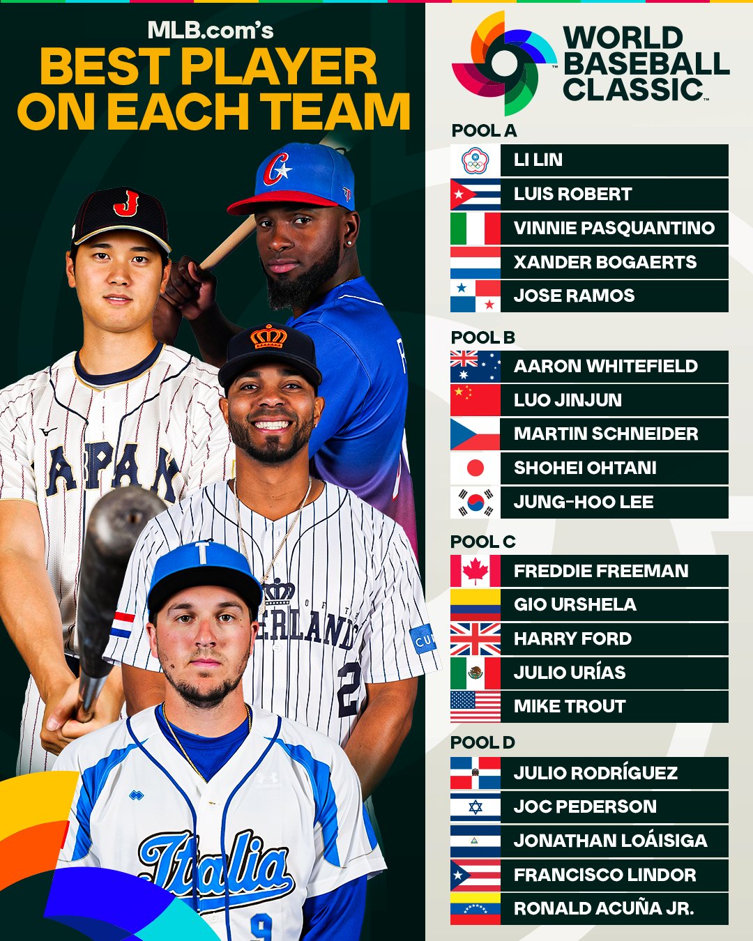 B組的日本隊則毫無疑問地選上「二刀流」大谷翔平、韓國隊為大聯盟非常注意的「風之孫」李政厚、C組美國隊自然是隊長、天使球星Mike Trout,D組波多黎各是Francisco Lindor。