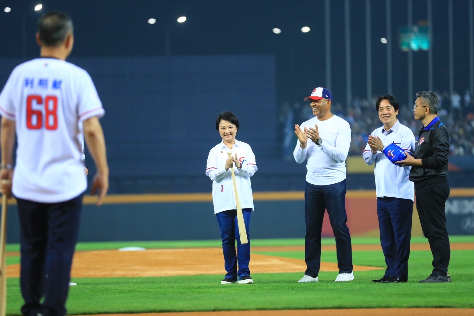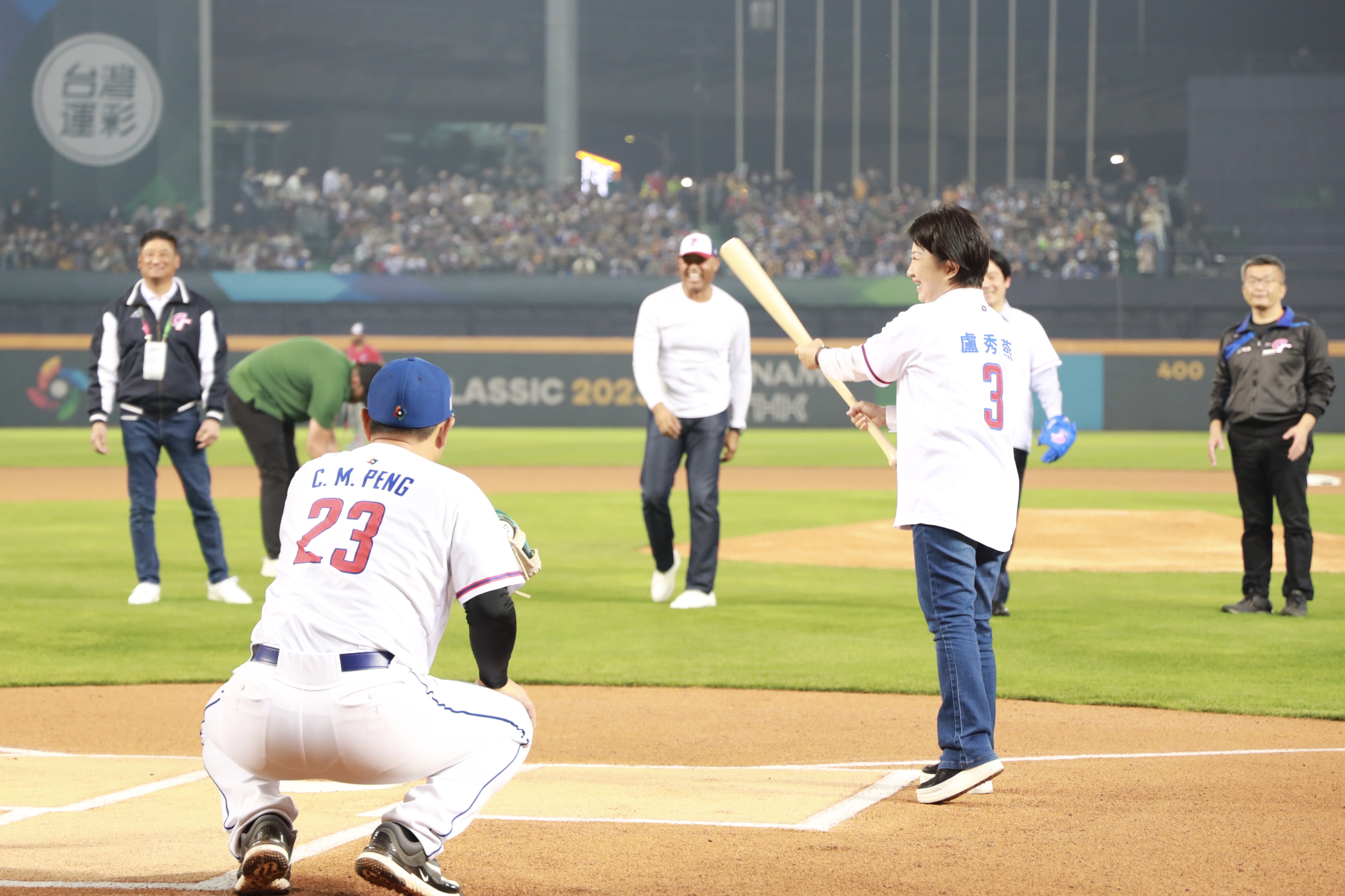 2023世界棒球經典賽(WBC)8日起在台中洲際棒球場重磅登場,吸引滿場球迷湧入,洋基守護神李維拉(Mariano Rivera)首次到台中,與副總統賴清德、台中市長盧秀燕、中國信託銀行董事長利明献、中華隊教練團王建民、彭政閔共同擔任開球嘉賓,李維拉、賴副總統投出漂亮的一球,利董事長、盧市長強力揮擊,為國際頂級棒球賽事揭幕。盧秀燕特別別上中華民國國旗胸章,身穿3號球衣。