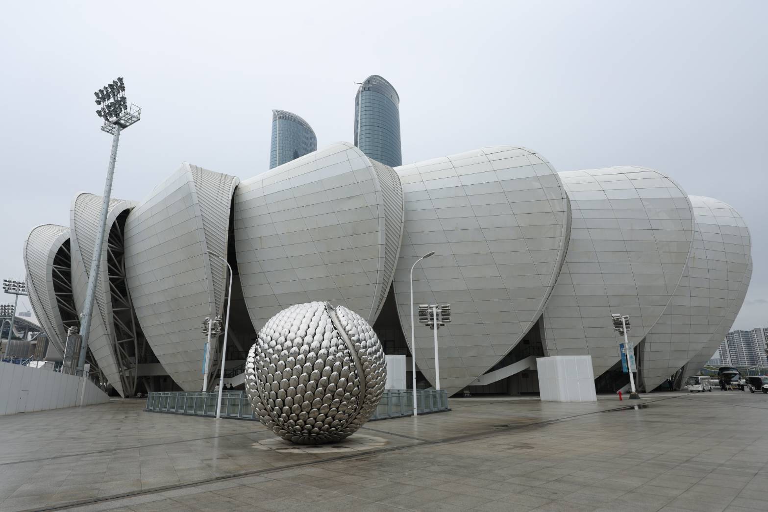 其中主球場由24片花瓣造型鋼結構包覆,頂部由8片花瓣造型鋼板構成可移動屋頂,可根據天候關閉或開啟,用時約15分鐘,因此被稱為「小蓮花」。球場第1位體驗球員就是去年剛宣布退休的瑞士天王Roger Federer,2019年受邀來此參加天貓盃國際網球邀請賽,打過2場,曾表示對此球場印象深刻。