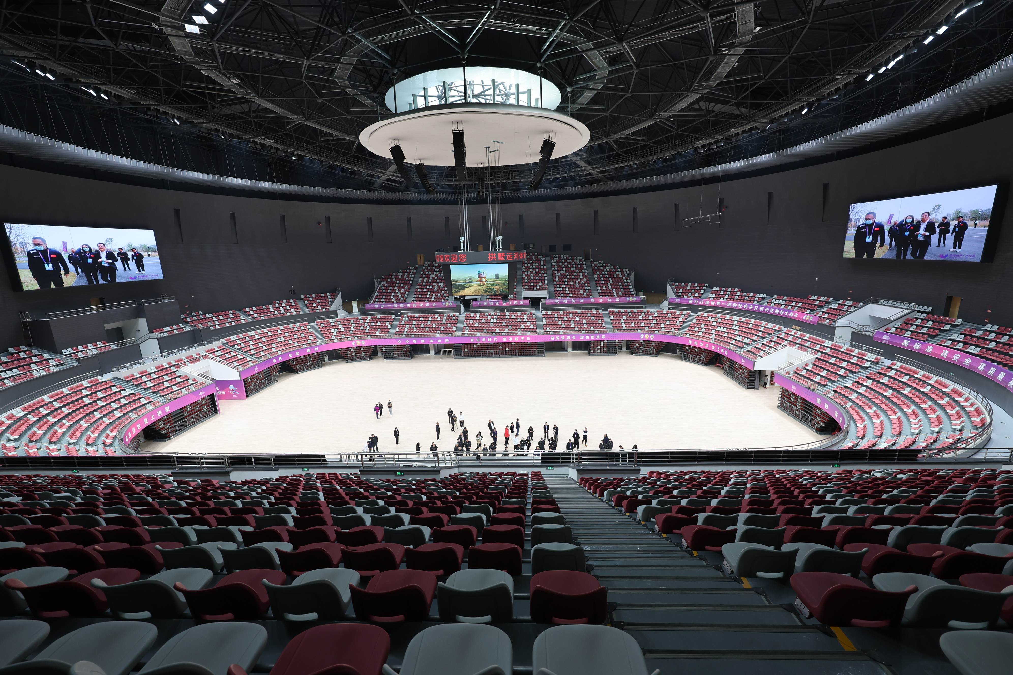 杭州電競中心除外型前衛,內部也運用不少科技來打造專屬電競場地,包括場館周圍使用蜂窩板來去除回音,除大螢幕還設置環場螢幕讓視線無死角,使用雙電路系統還儲備18組供電系統保障賽時用電,此外觀眾席下空調出風口也將能在9月時飄散杭州市花桂花香氣,讓現場觀眾有5D享受。