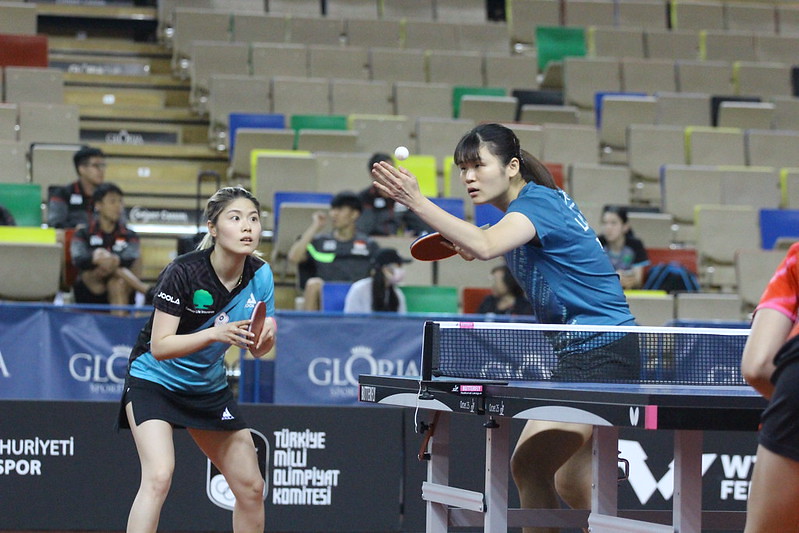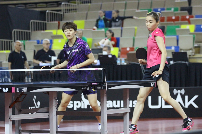 由於對對手來球意外露出有趣表情的老將搭檔黃怡樺(左)、劉馨尹。(30日比賽照,取自World Table Tennis)