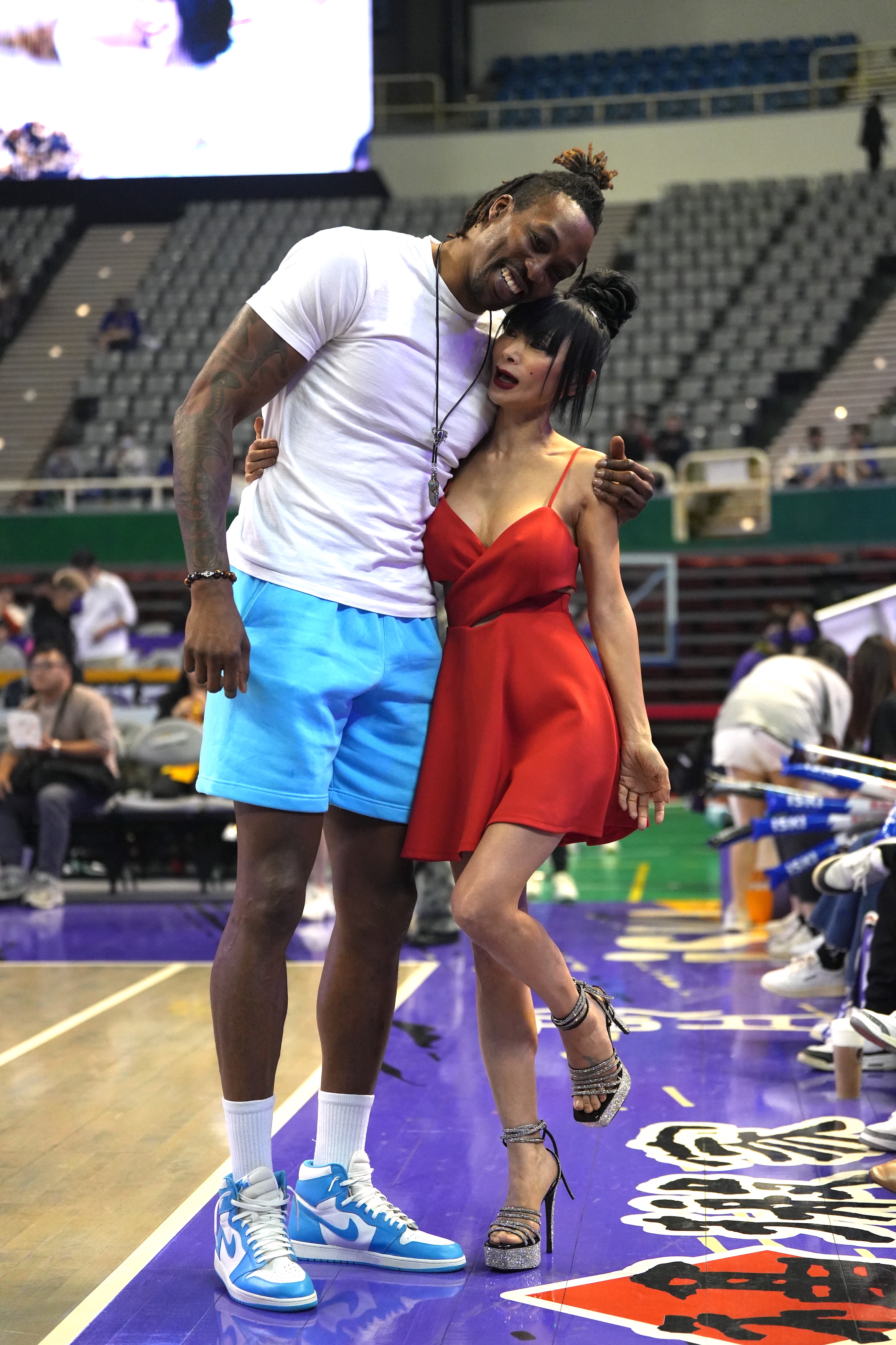 霍華德今天賽前因膝蓋不適,預計不會上場,穿便服現身球場。而藝人白靈因為在台灣拍戲,受雲豹邀請來主場加油打氣,霍華德和白靈賽前在場邊寒暄了幾分鐘。(李宇政攝)