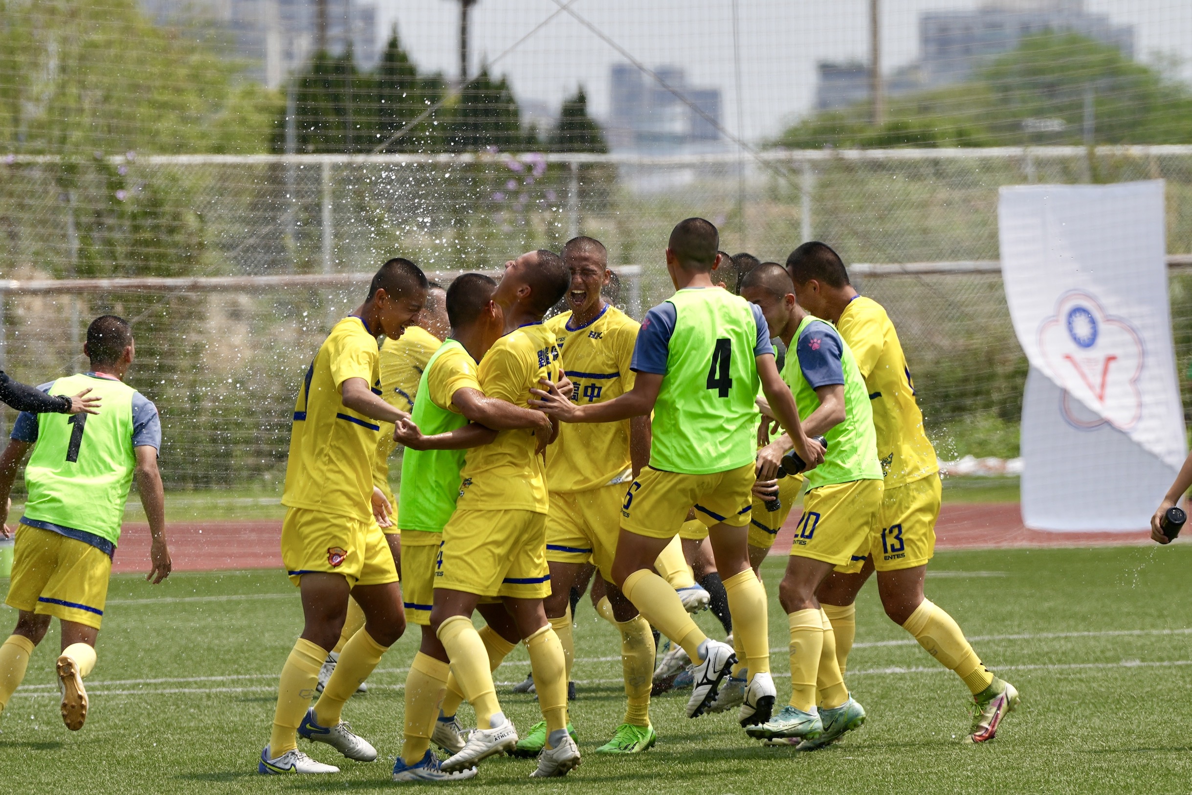 另外,上學年高男組亞軍北門高中,和上學年第4名中山工商在正規時間踢成3比3平手,北門最後在PK大戰以4比3獲勝,晉級四強。在PK大戰踢進最後致勝一球的劉鎧瑞,欣然接受隊友潑水「洗禮」。