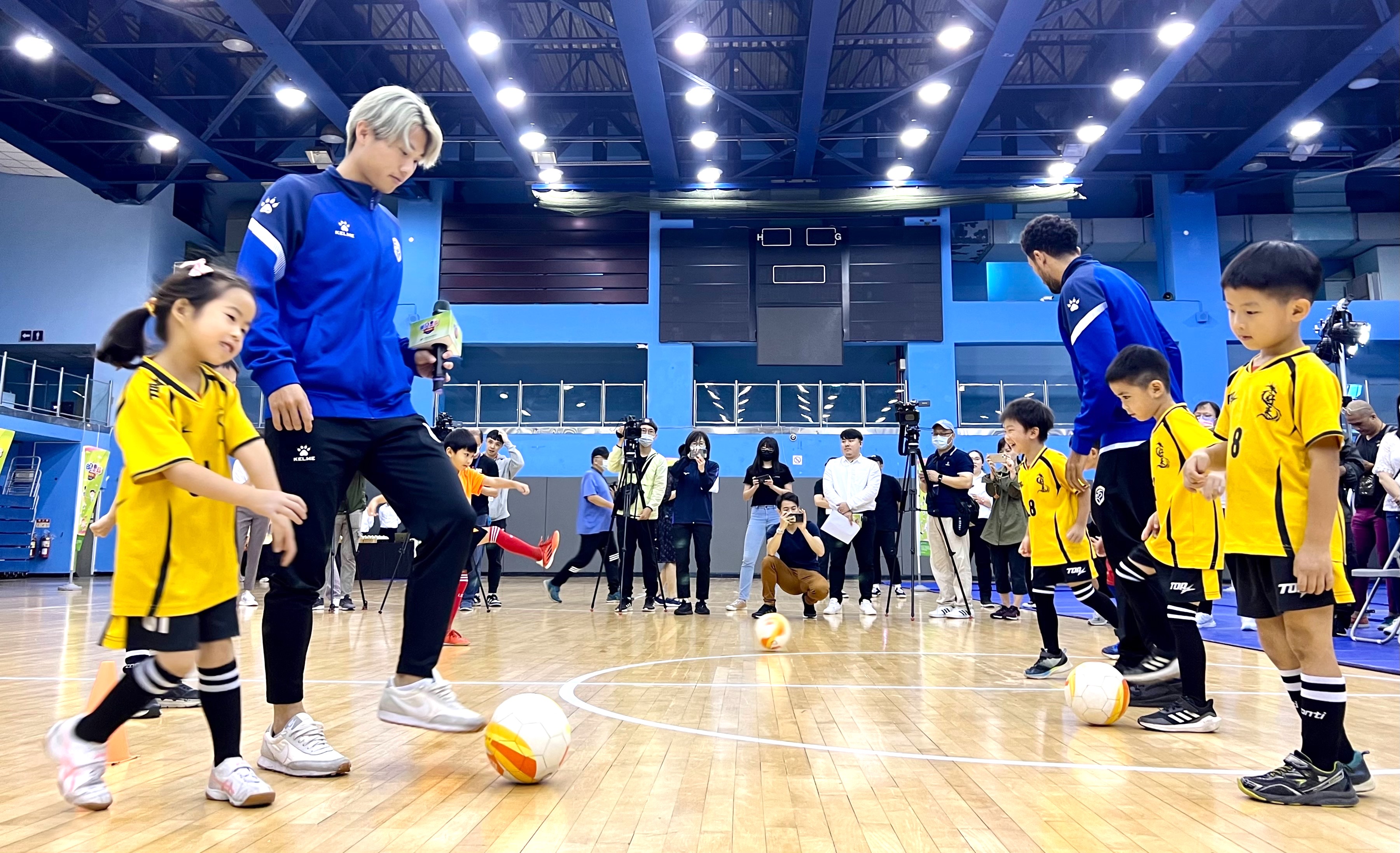 台北龍足球俱樂部成員教導幼童足球技巧。(李宇政攝)