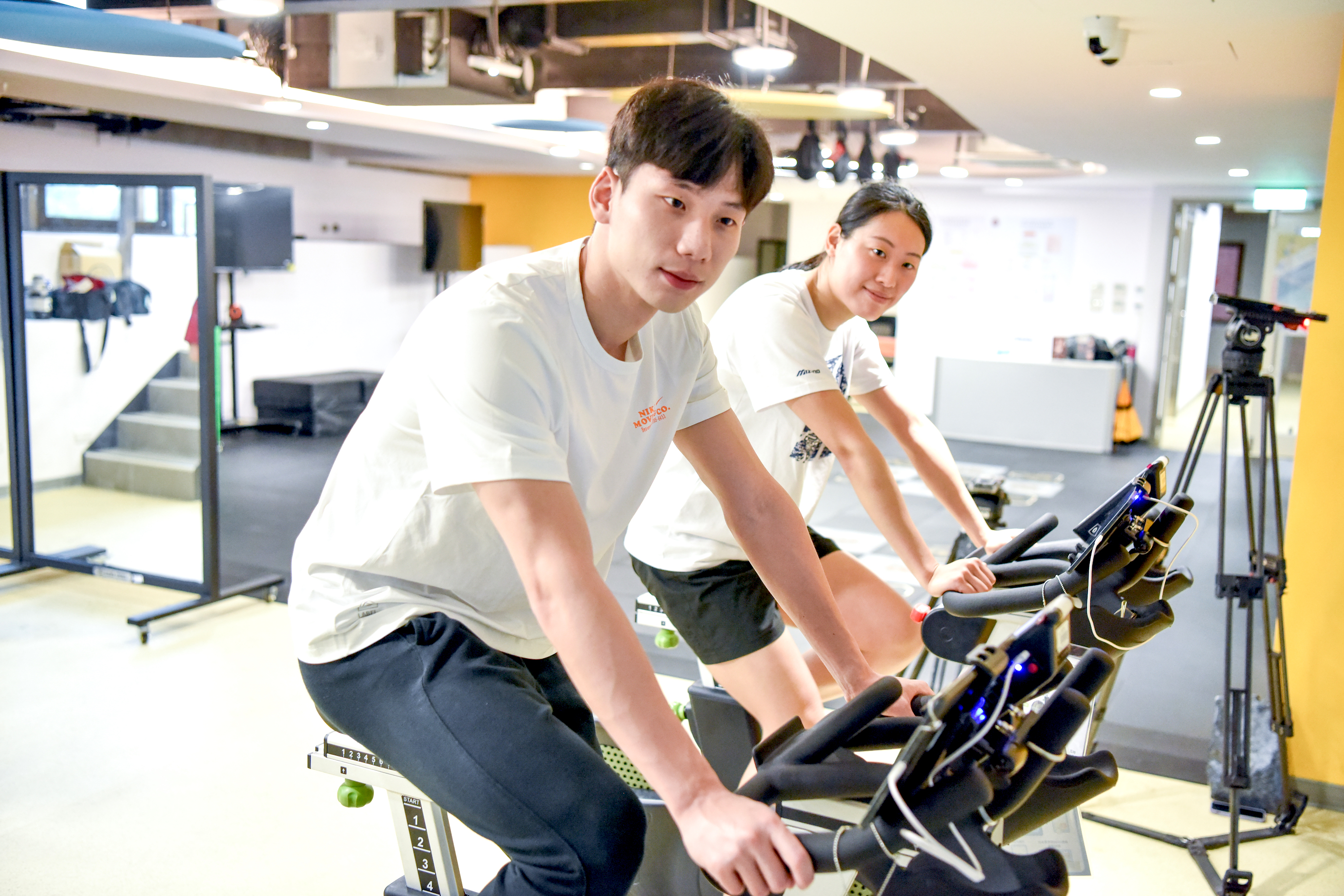 王冠閎及黃渼茜利用全新的智能健身中心,接力完成自行車和游泳,示範今年新增的智慧鐵人兩項競賽。(台灣師大提供)
