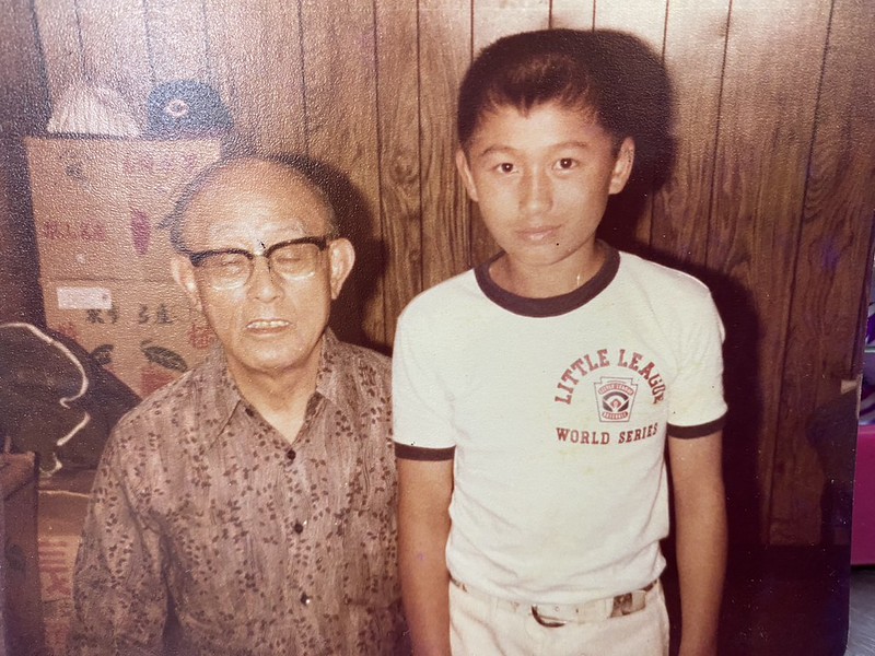 張正憲與「少棒之父」謝國城在美國威廉波特選手村的小木屋合影。圖/張正憲提供