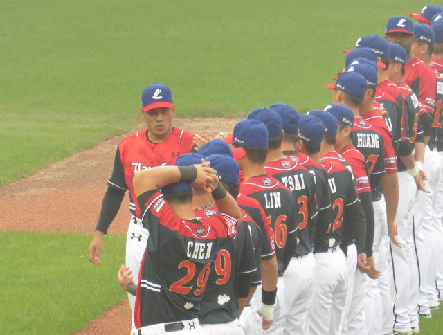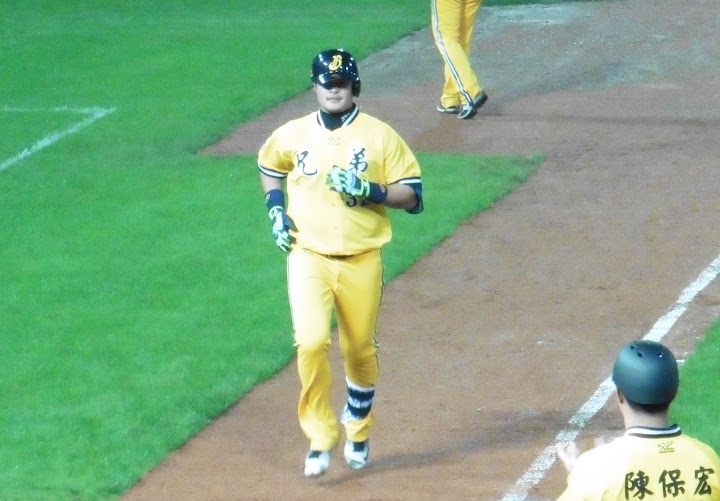 介紹球員時,林智勝穿黃黃的從一壘球員休息區跑出來,啊好怪喔,雖然對整個中職大環境真的是一件好事情,但情感上還是無法接受啦XD