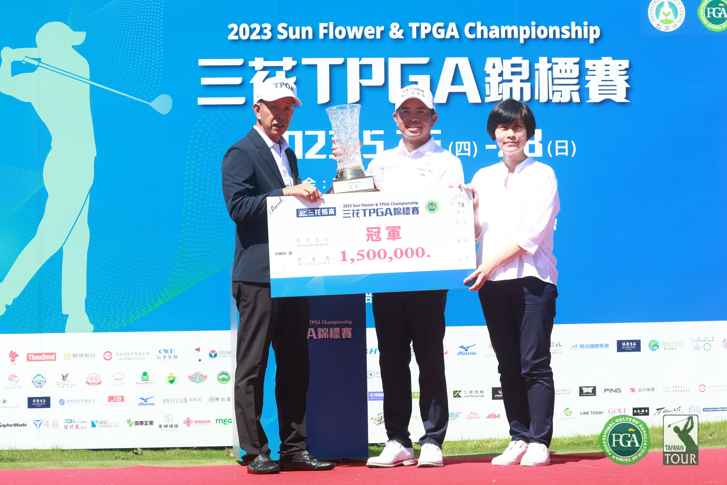三花棉業公益教育基金會執行秘書蘇文娟(右)和台灣職業高爾夫協會理事長陳榮興(左)頒冠軍獎金及冠軍盃給詹世昌。(大會提供)