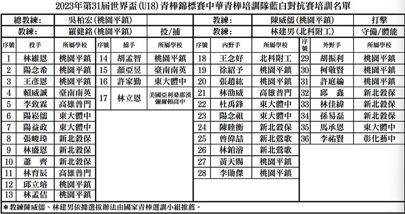 為備戰今年在臺灣舉辦的第31屆U18世界盃青棒錦標賽,中華民國棒球協會今(3日)召開國家青棒選訓小組會議,選出參加藍白對抗賽36人名單,預計6月19日開始集訓,要全力將冠軍獎盃留在台灣。