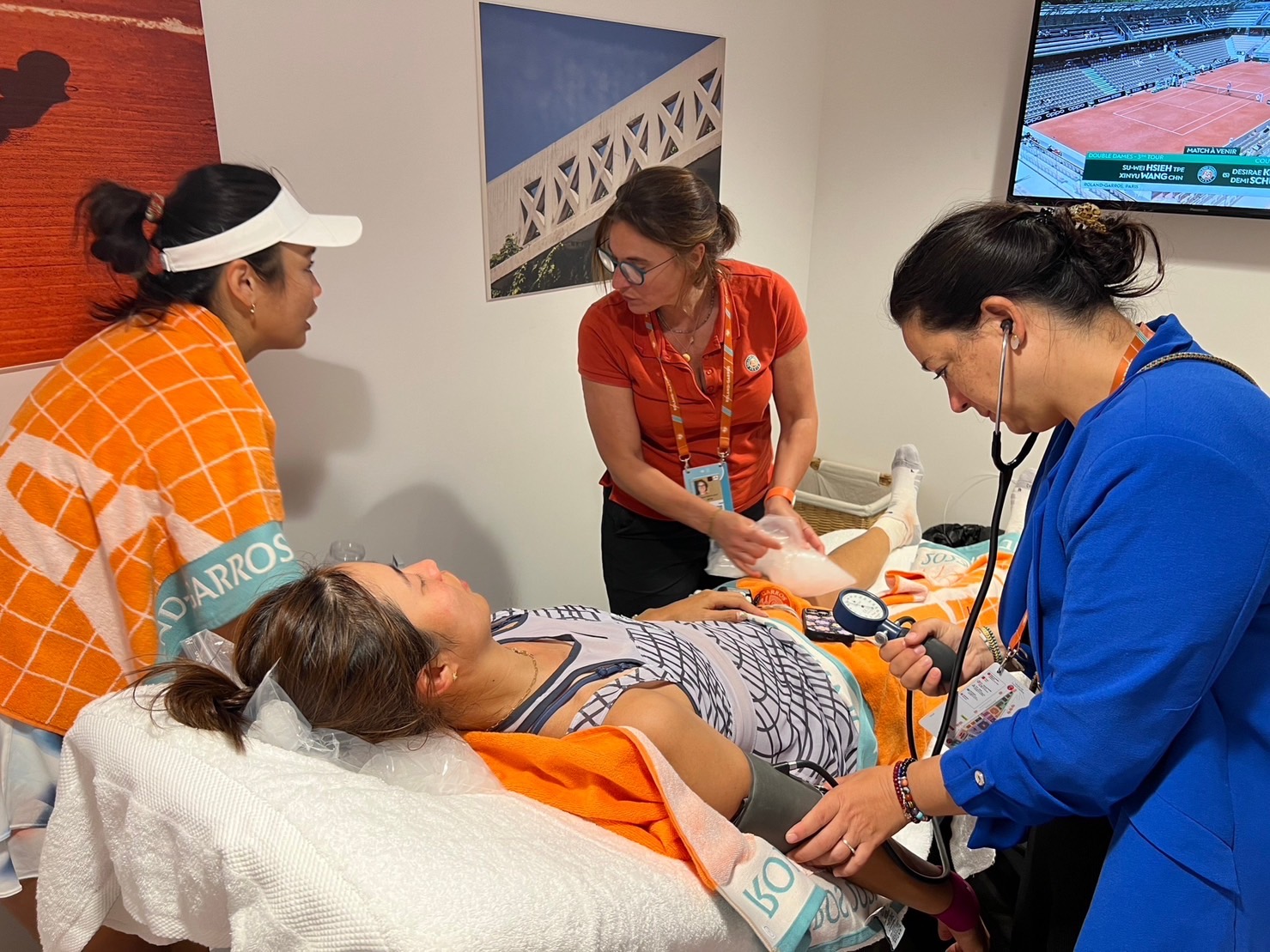 詹皓晴賽後立即進防護室接受醫師診治,詹詠然在旁關心妹妹病況。(劉雪貞提供)