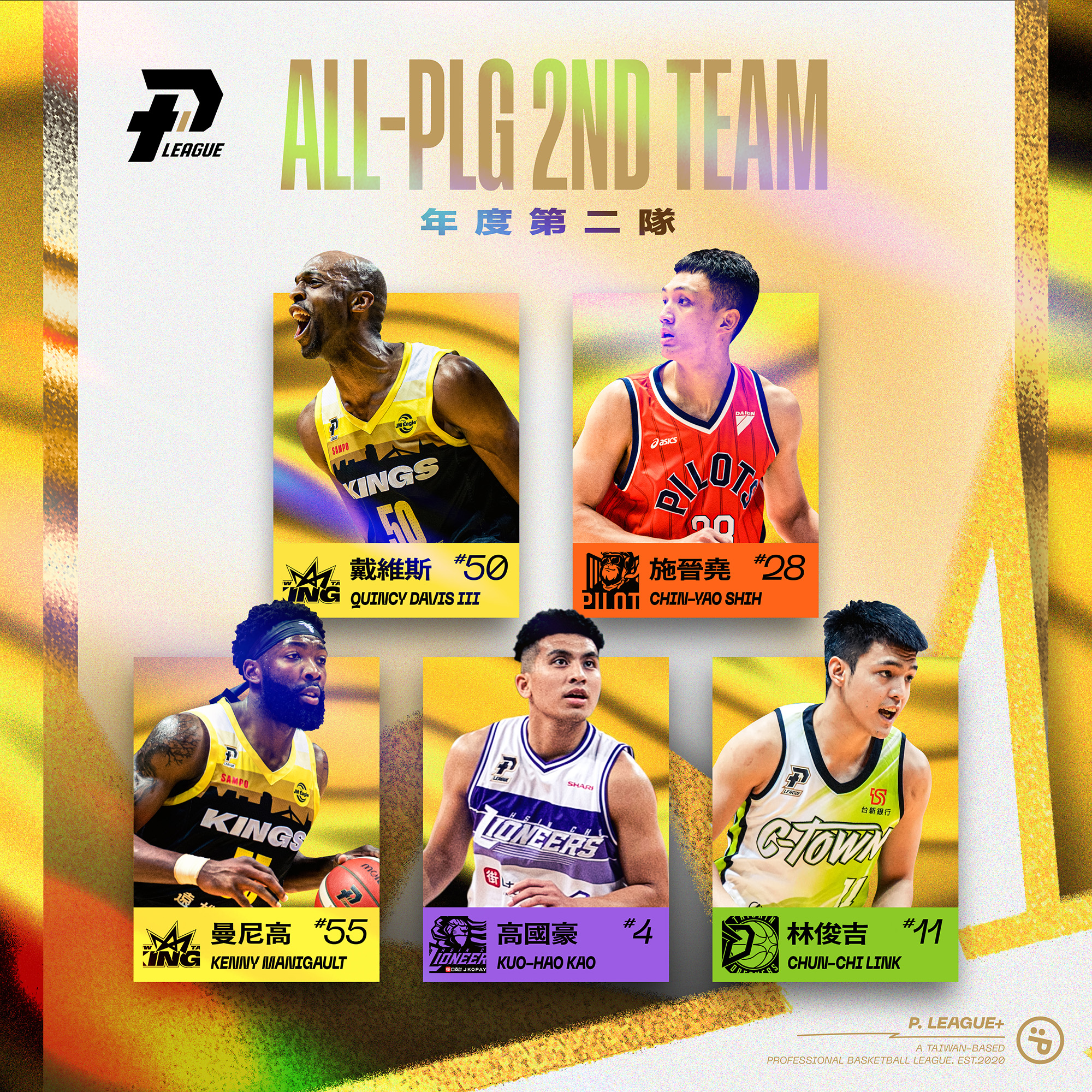 年度第二隊方面,後場有年度抄截王曼尼高(Kenny Manigault),搭配年度第六人、福爾摩沙台新夢想家的林俊吉,以及同時入選年度防守第一隊、新竹街口攻城獅的高國豪,前場則有新北國王的戴維斯,以及桃園璞園領航猿的施晉堯。