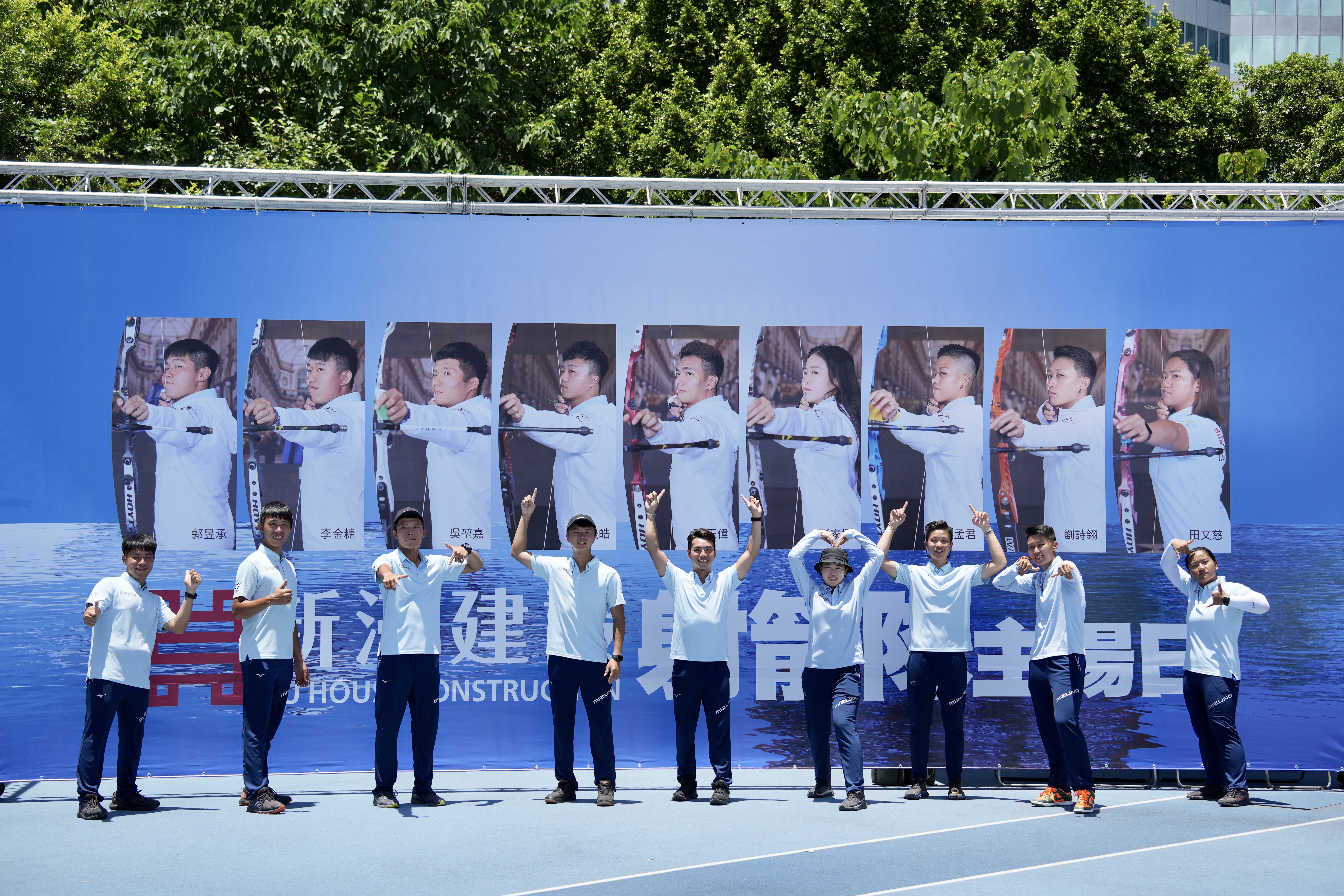 新濠建設主場週在比賽場地掛起所屬選手巨幅海報看板。(中華企業射箭聯盟提供)