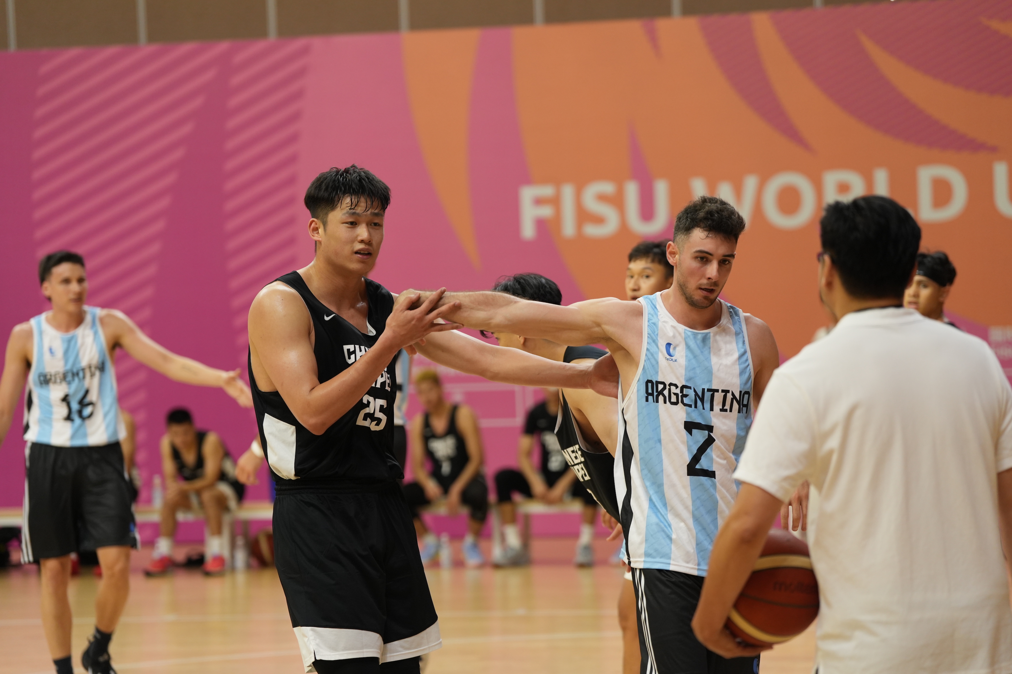 世大運男籃中華隊和阿根廷隊昨天(27日)打了一場友誼賽,為正式比賽暖身。林正也替姊姊加油說,「她們最近應該很有機會,就是會替她加油。」(李宇政攝)